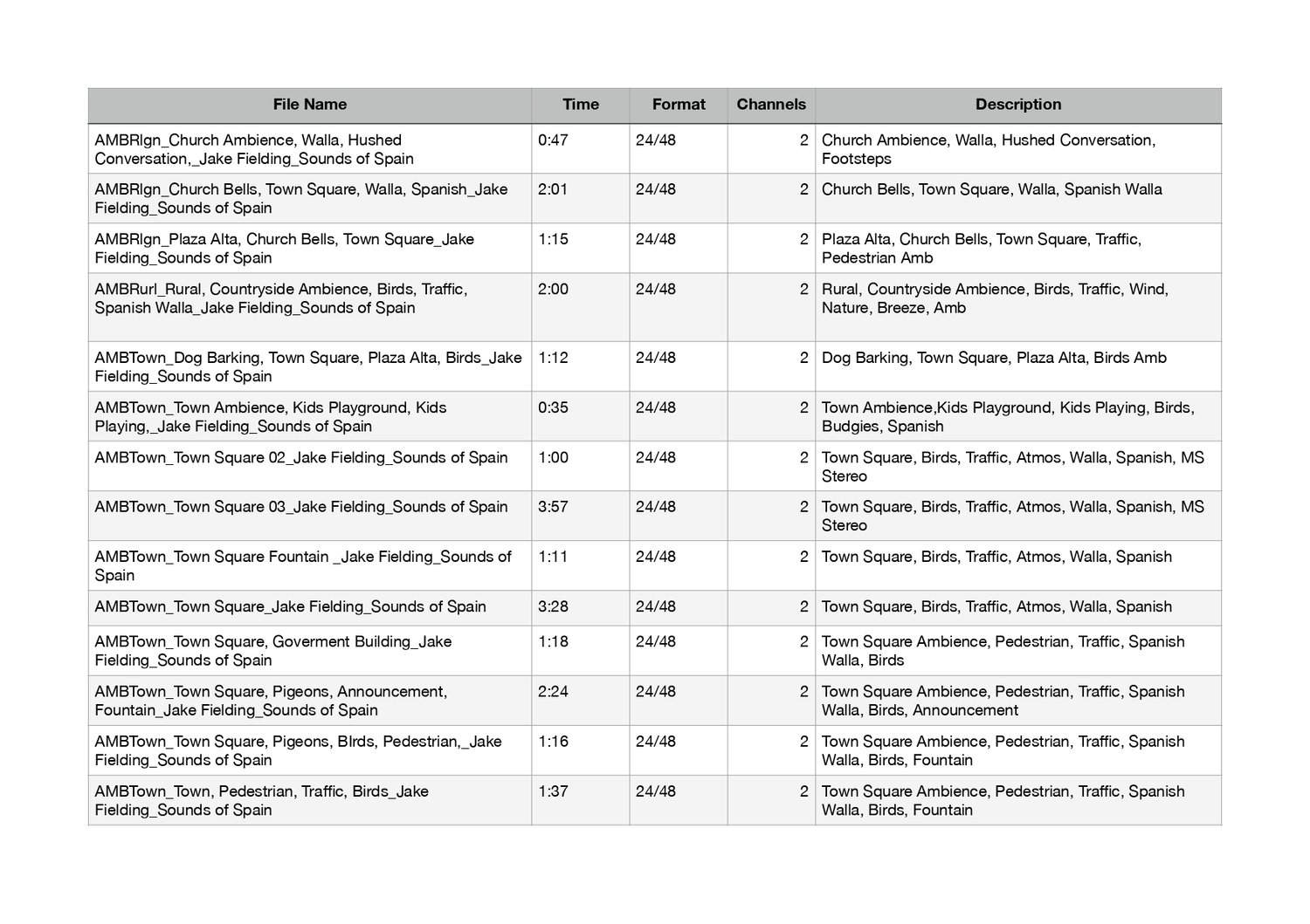Indispensable for projects seeking genuine and distinctive atmospheres from Southern Europe, this comprehensive pack features a wide array of recordings. From lively town squares and restaurants, cafes to playgrounds, cliffs, and tranquil coastal bays, from reverberating churches to bustling underpasses, offices, vast fields, and bustling markets - each sound captures the essence of a trip to Spain.