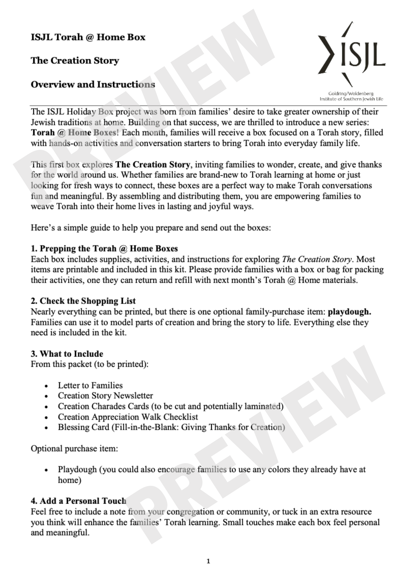 This is our full kit for the ISJL Torah @ Home - Creation Story. It includes all of the printed material, including the Creation Story scavenger hunt, games, a shopping lists for the boxes and more! Use this kit to help engage families with Judaism at home and connect with one another. The ISJL will be releasing Torah boxes throughout the year and the guides are completely FREE! Enjoy!