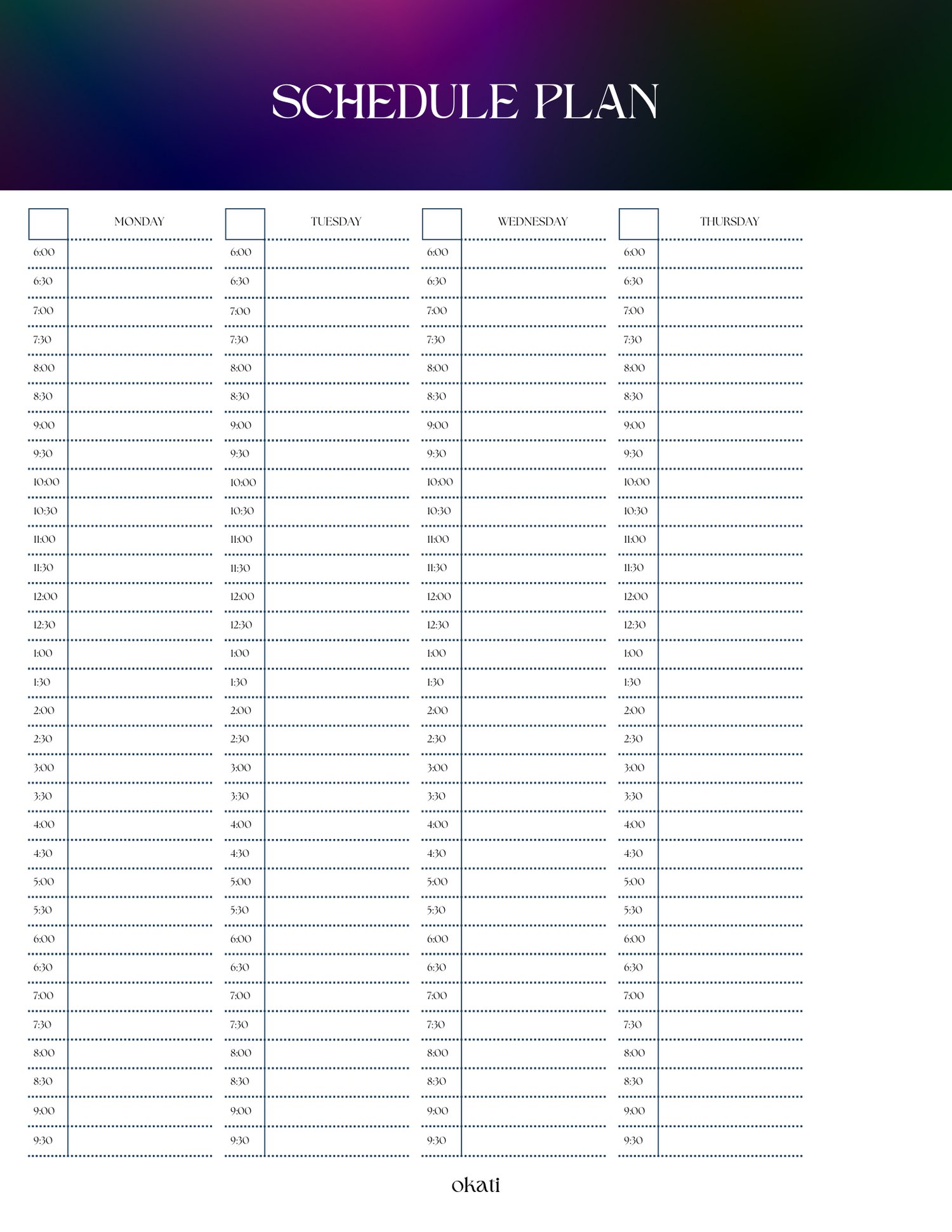 • Daily Time Slots: Each day is broken down into 30-minute intervals from 6:00 AM to 9:30 PM.