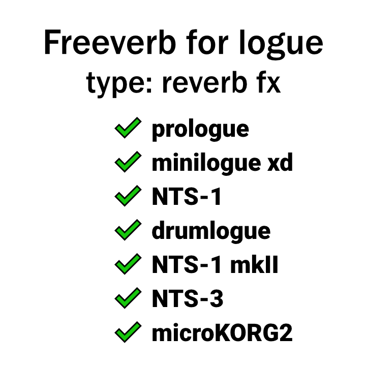 This is a logue SDK port of Freeverb reverberator by Jezar at Dreampoint. Prologue, minilogue xd, NTS-1, drumlogue, NTS-1 mkII, NTS-3 and microKORG2 (v2.0) are supported.