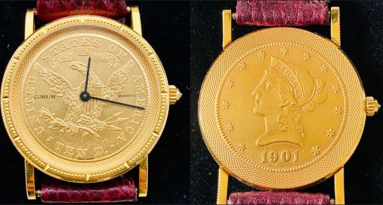 Beautiful Corum 22k Gold Eagle Liberty 10 Ten Dollar Coin 1901 π₯β¨π€© with a real diamond crown (VS clarity, color G to H) π, running a Corum quartz signed caliber keeping perfect time ππ».