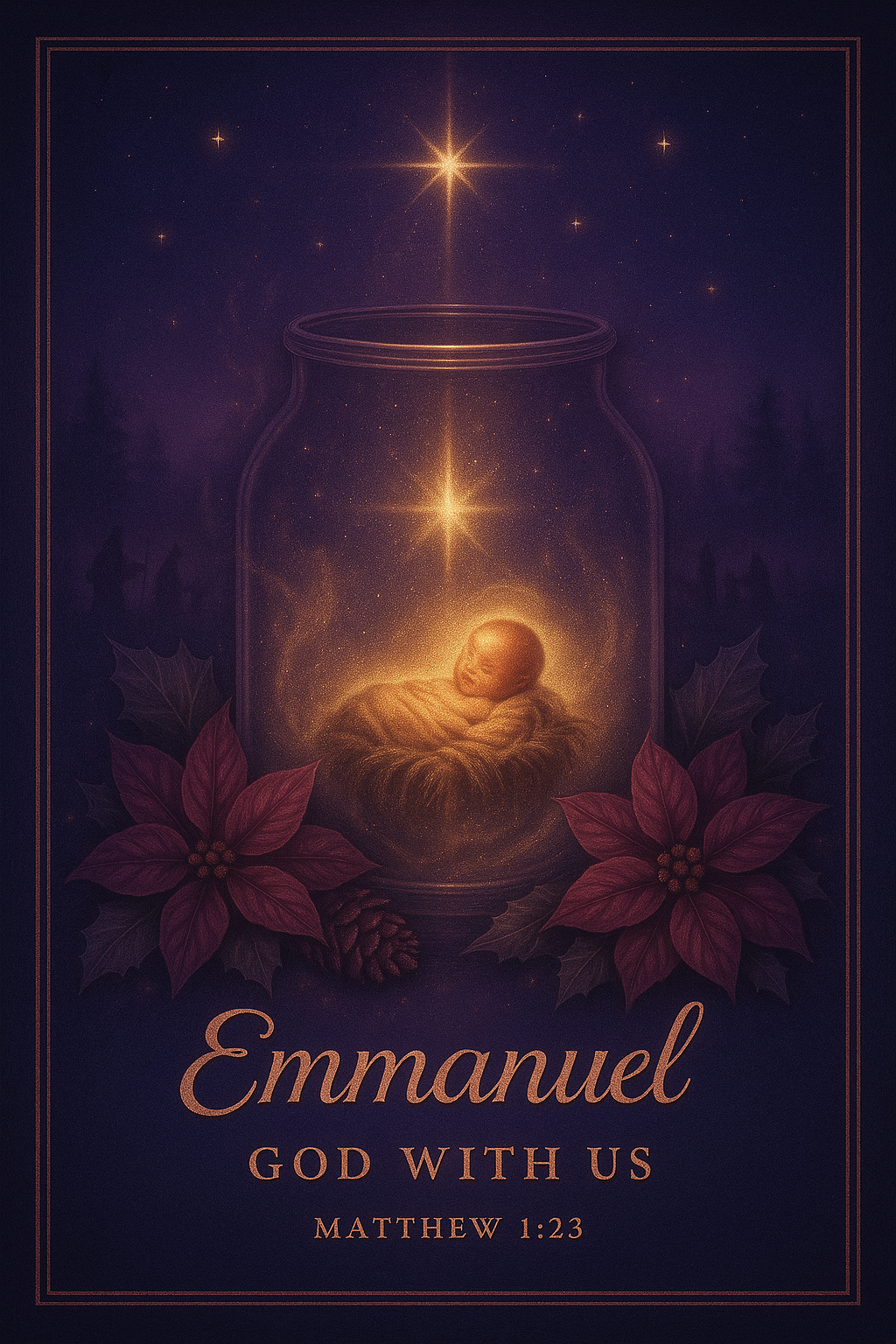 Honor the miracle of Christβs birth with this Christian wall art featuring Matthew 1:23. A glowing baby rests inside a glass jar, surrounded by poinsettias and pinecones, under a radiant star in a peaceful forest night. This printable evokes reverence, divine presence, and the promise of Emmanuelβperfect for Christmas scripture decor, ministry bundles, devotional gifts, and inspirational holiday printables.