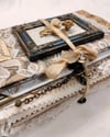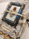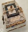 Blue Rose has 156 pages, 7 tags, 34 pockets/tucks, 26 journaling cards, 1 envelope, 6 special ephemera (including the separate folio on the cover) within 5 signatures. The hard cover measures 6in tall x 4in wide x 1.5in thick. The papers are arranged in different widths and heights, but the tallest are 7.5 inches, and the widest are 5 inches.