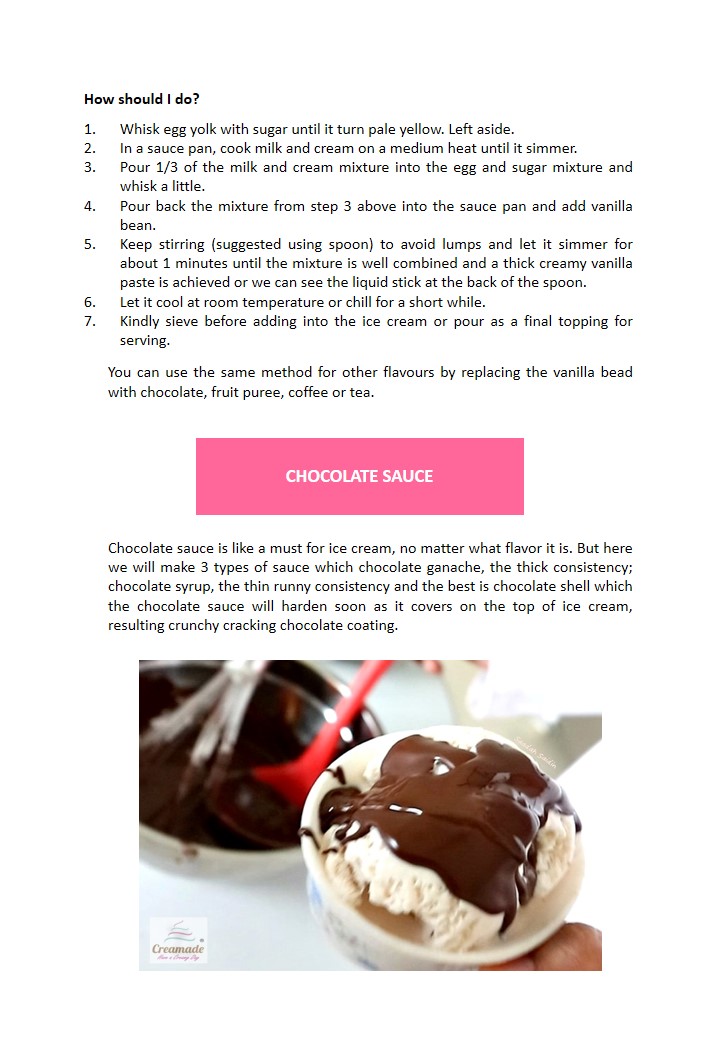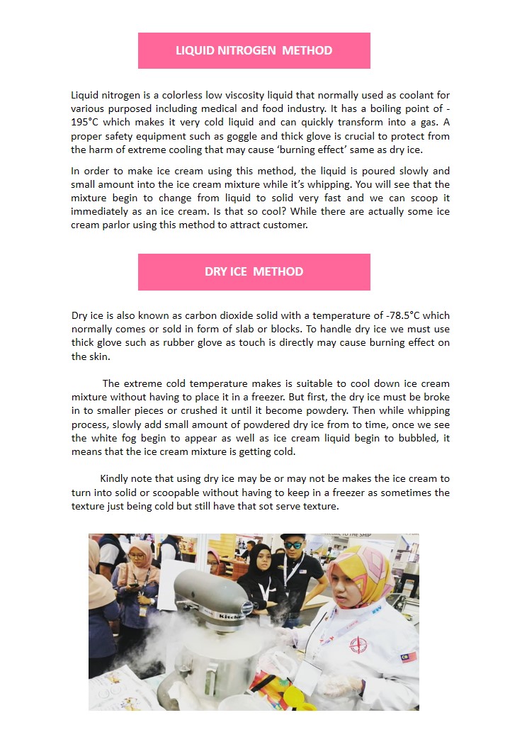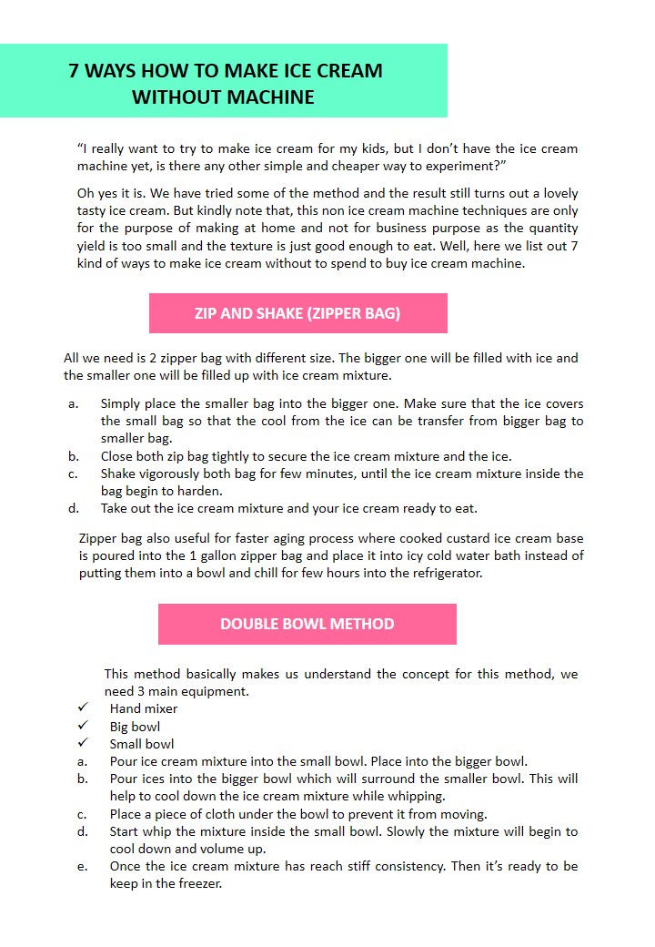 and this e-book specifically various methods on how to make ice cream without ice cream machine. By knowing basic tools and equipment you can make ice cream at home with your kids, or if you are teacher, it could be fun activities that upgrade students skills. Besides some of the methods can be used to start your ice cream business either from home or operate in a shops.
