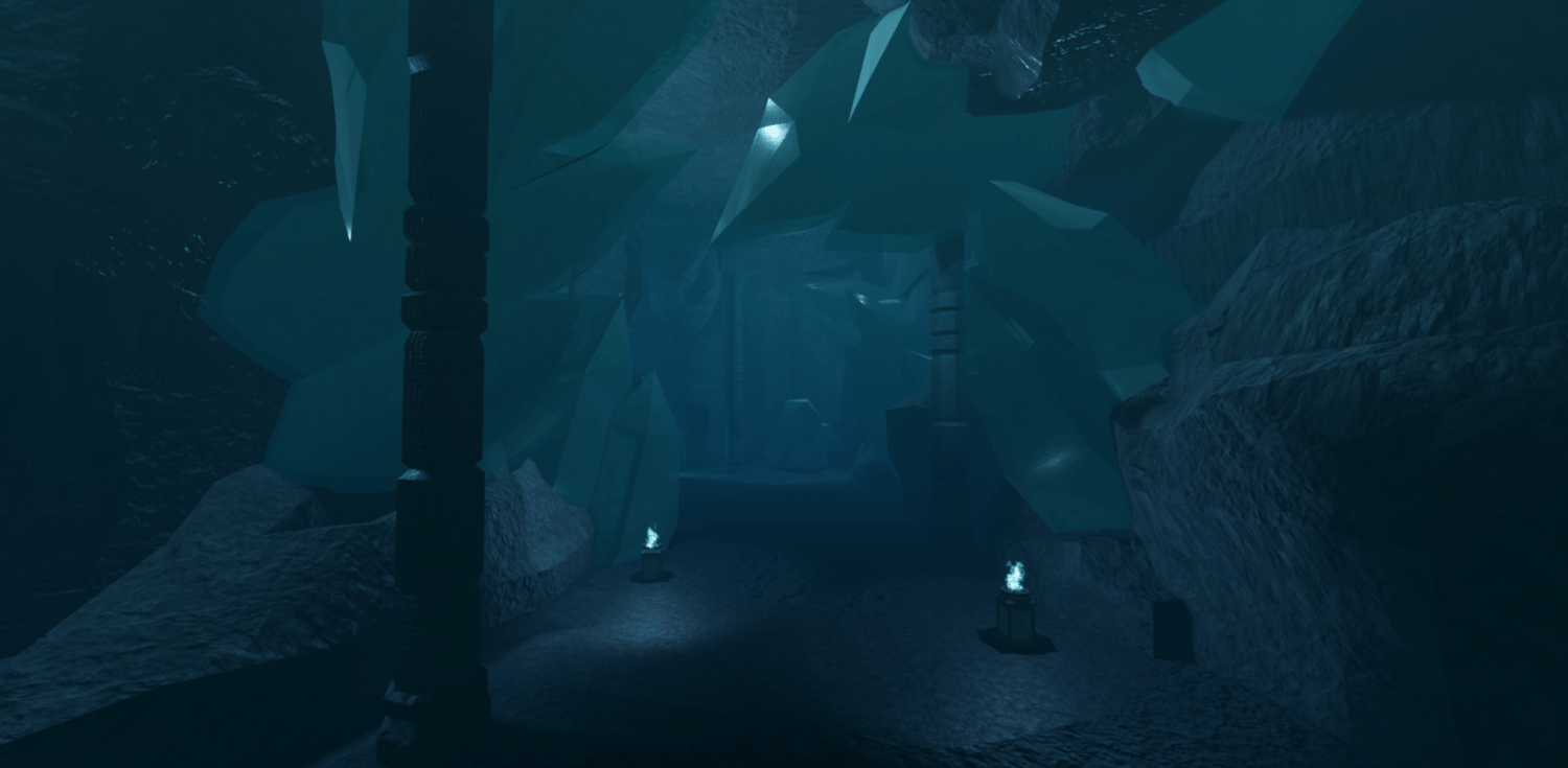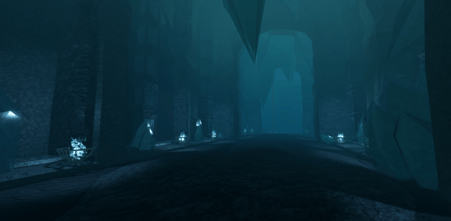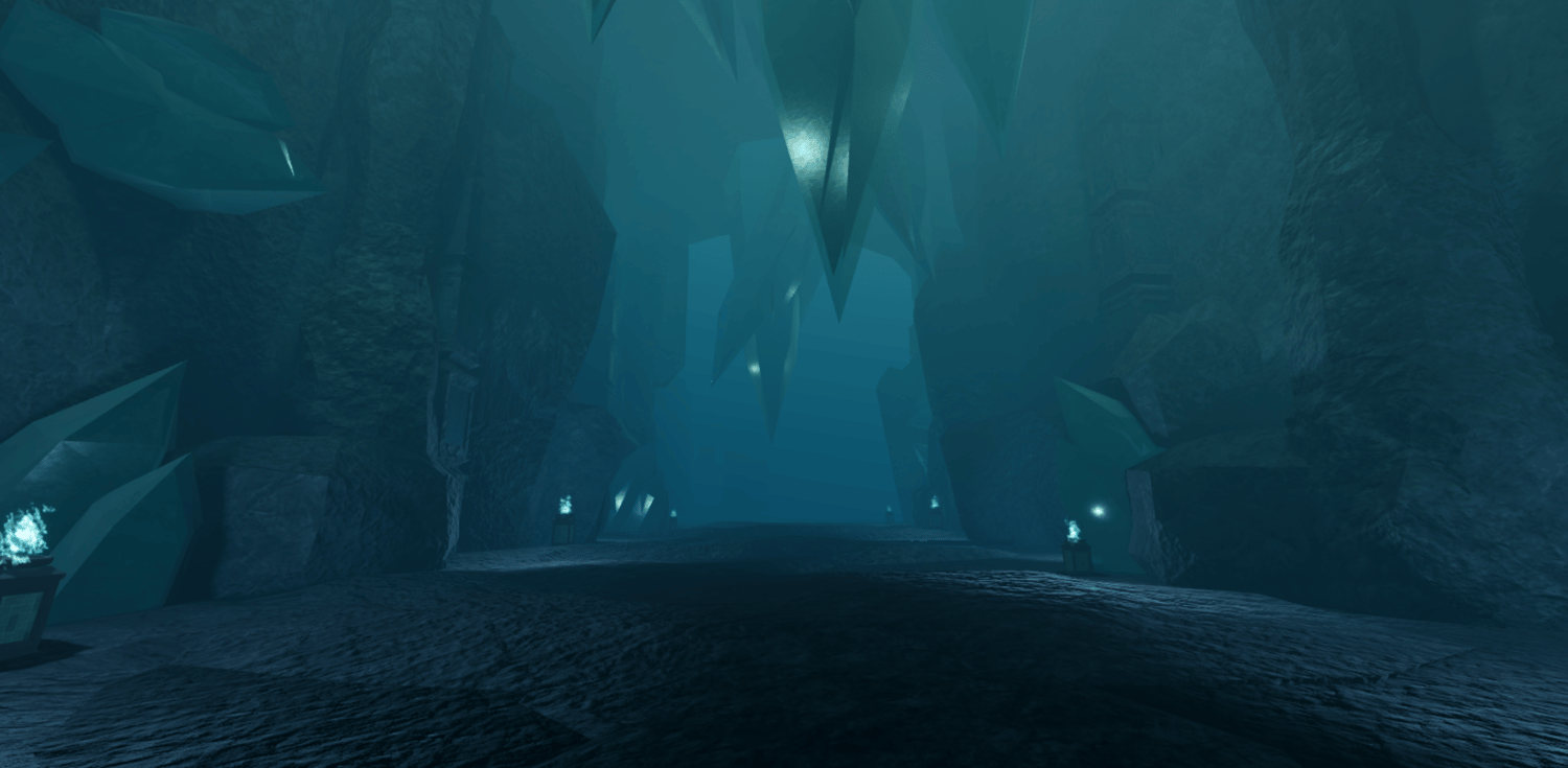 A mystical Roblox cave dungeon featuring towering crystal formations, deep blue lighting, and massive carved stone halls. Players explore winding paths, echoing chambers, and ancient structures illuminated by magical flames. The environment blends fantasy and cave realism for a cold, atmospheric tone. Perfect for adventure, boss fights, and dungeon-crawler style games.