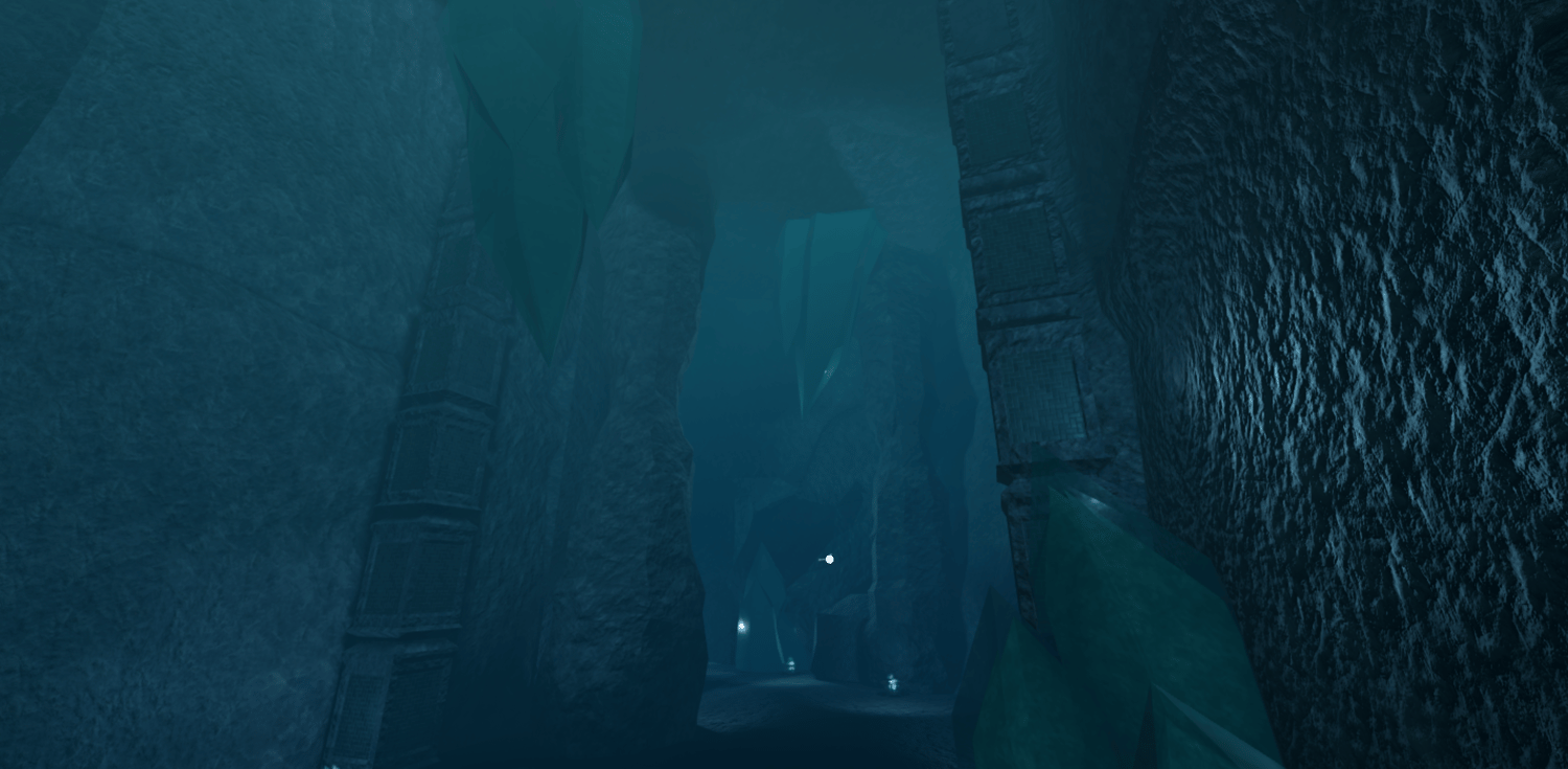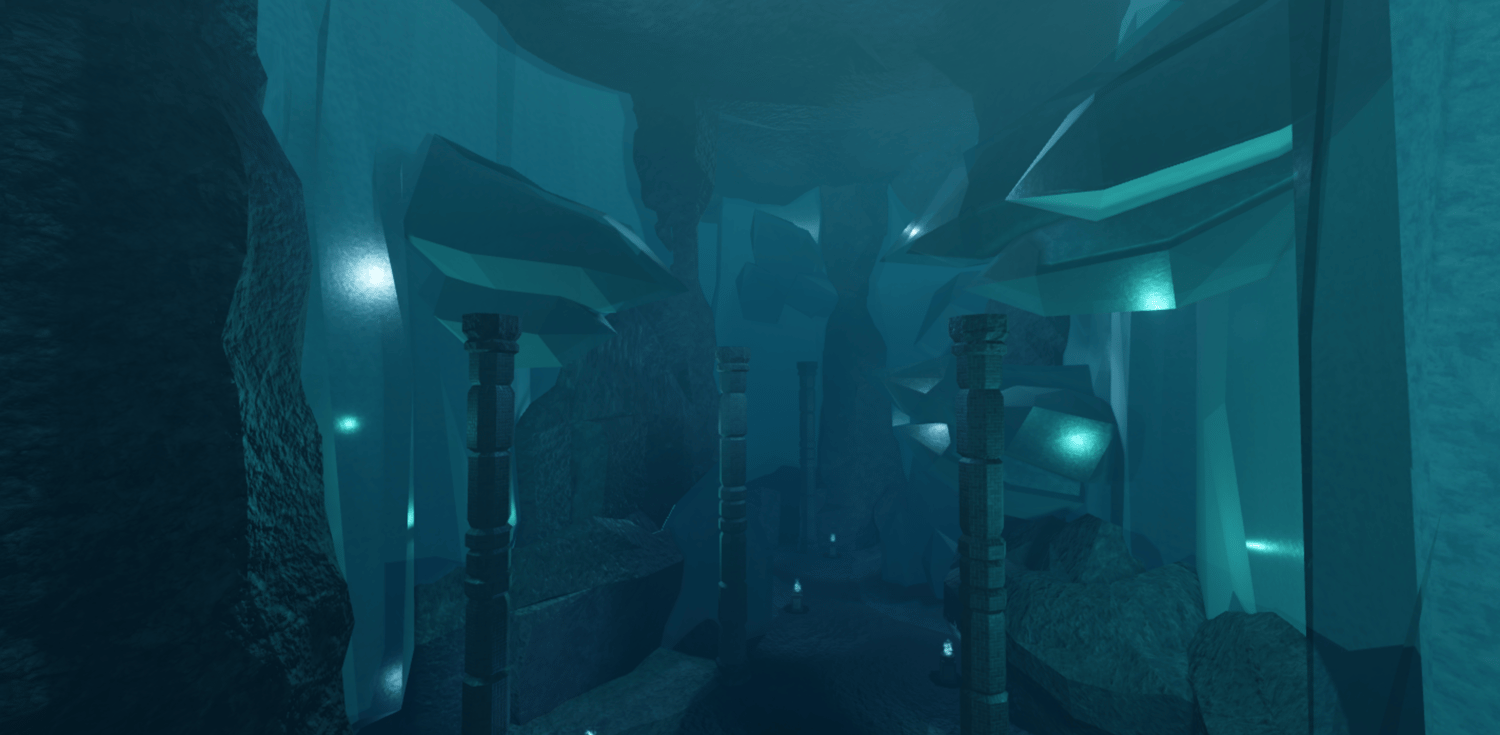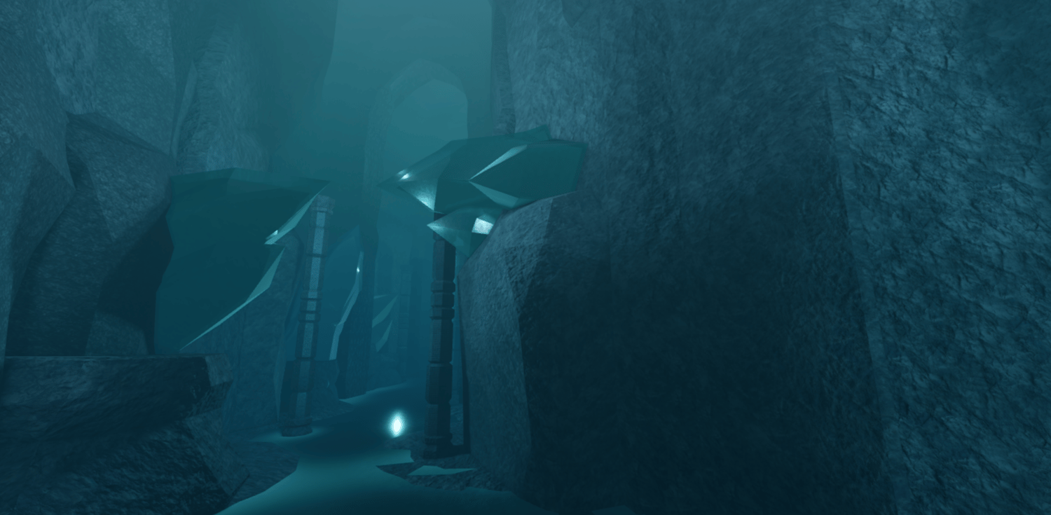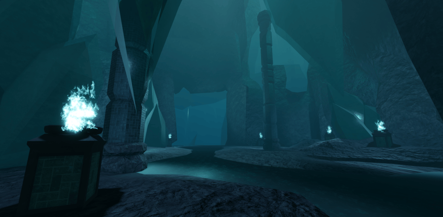 A mystical Roblox cave dungeon featuring towering crystal formations, deep blue lighting, and massive carved stone halls. Players explore winding paths, echoing chambers, and ancient structures illuminated by magical flames. The environment blends fantasy and cave realism for a cold, atmospheric tone. Perfect for adventure, boss fights, and dungeon-crawler style games.