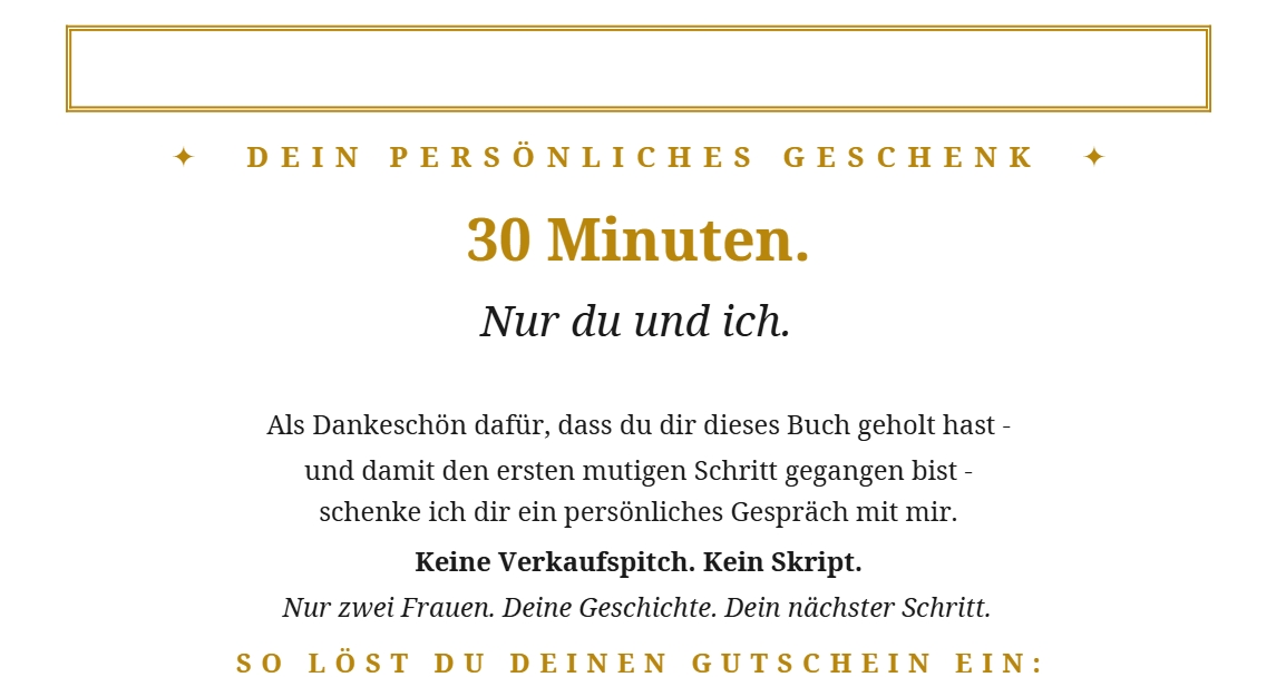 Deinen Gutschein für dein Gespräch mit mir im Wert von 300€ /30Min. findest du hinten im Buch, außerdem wartet noch ein kleines Geschenk auf dich im Buch.