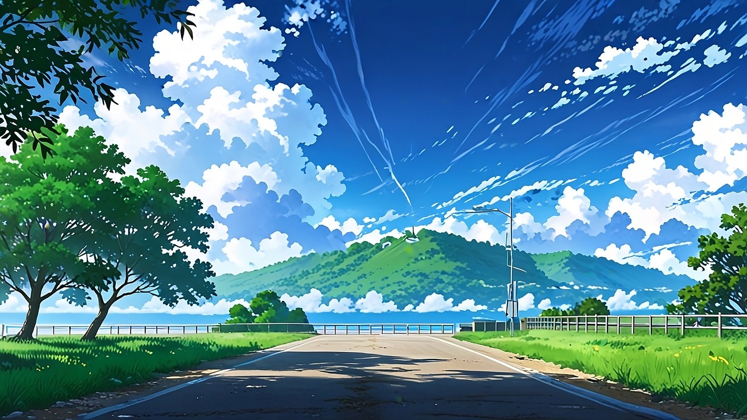 This image is an anime-style landscape depicting a bright and sunny day. The scene features a wide, open road that stretches towards a lush, green hill in the distance. The road is bordered by grassy fields, and the greenery is dotted with trees that provide shade and add to the tranquil atmosphere.