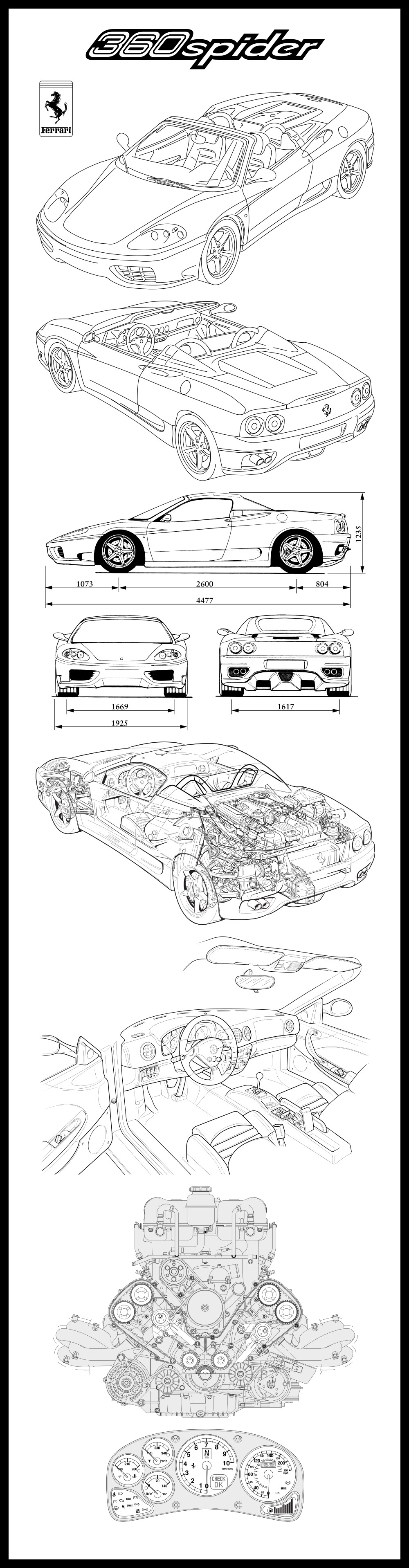 Ferrari 360 Spider Car Blueprint PDF SVG Vector Drawing.