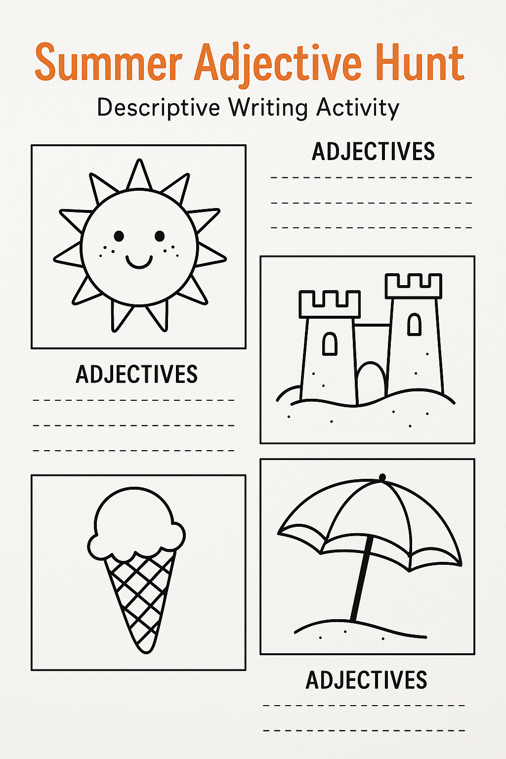 - 1 worksheet with four summer visuals (sun, ice cream, sandcastle, umbrella)