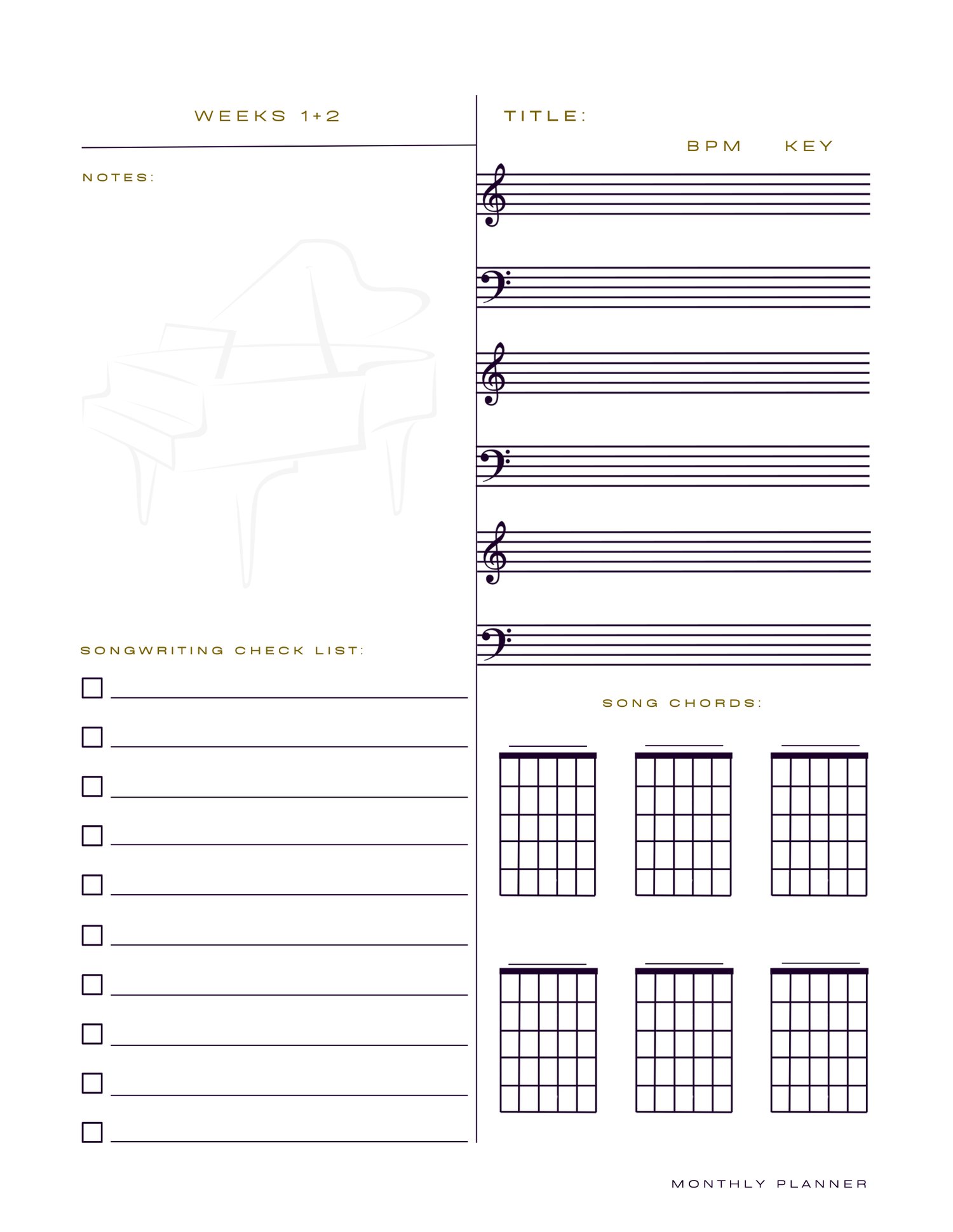 Keywords:Â musician planner, songwriting planner, monthly music calendar, creative scheduling, music organization tool, artist productivity