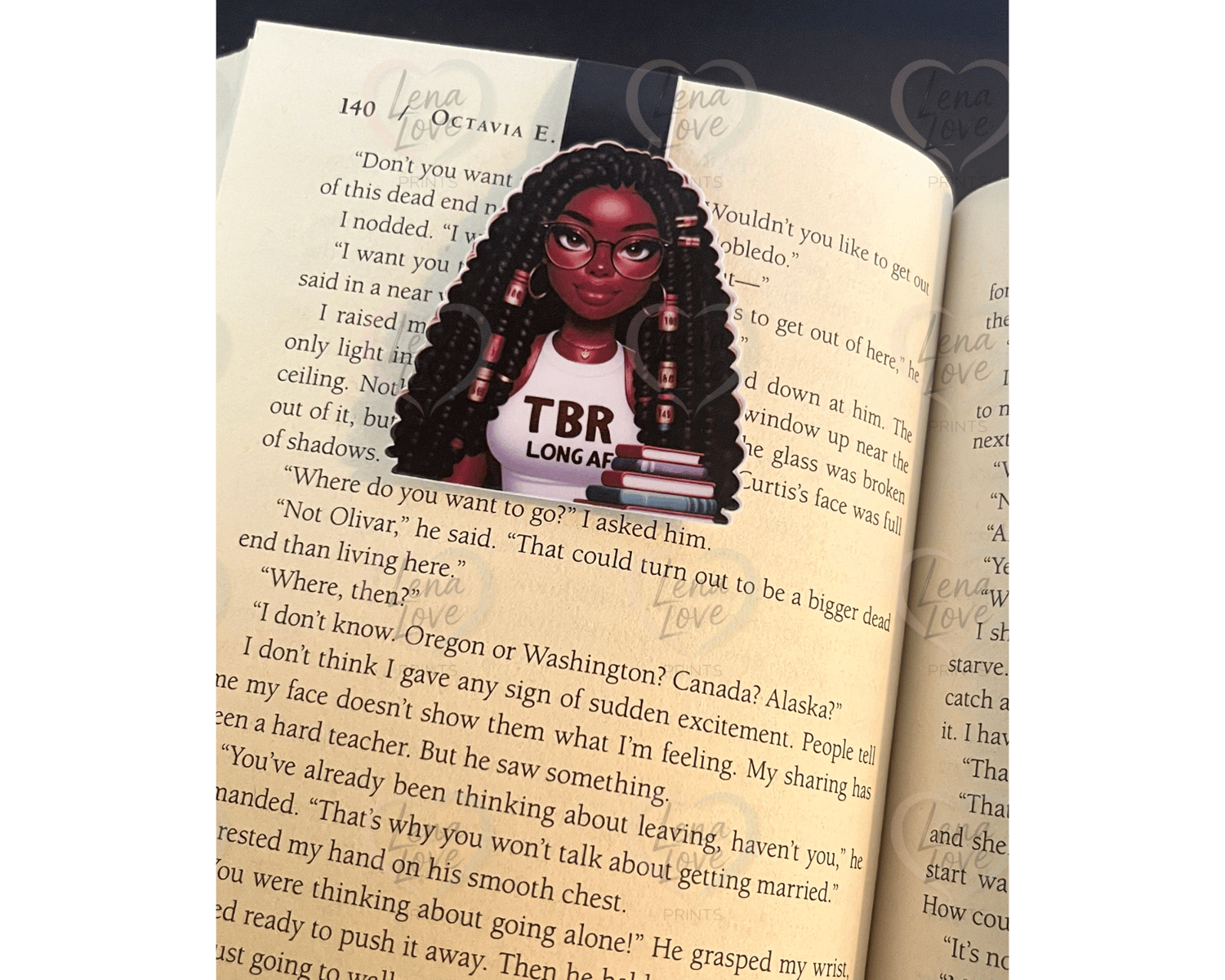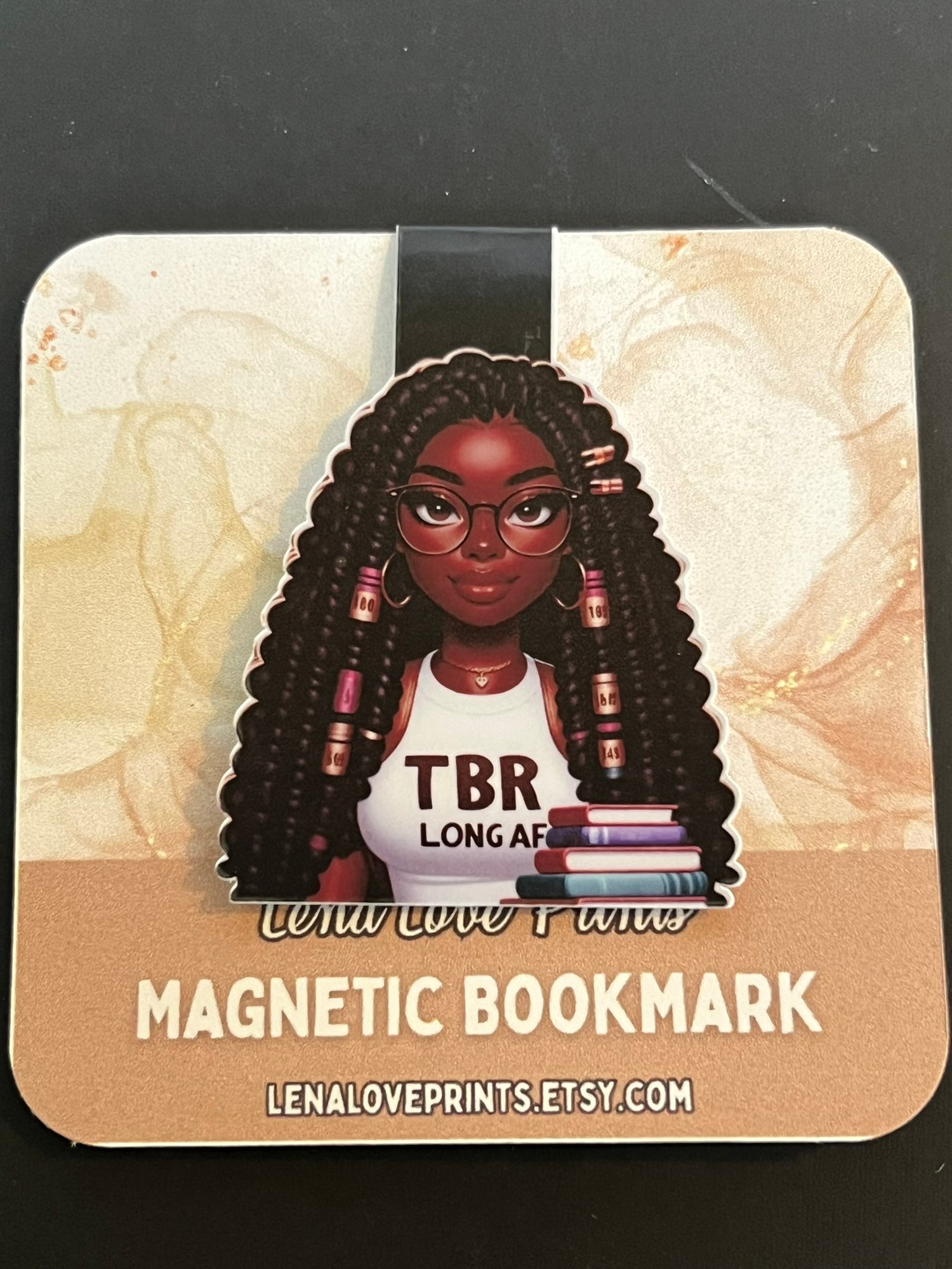 These magnetic bookmarks celebrate the beauty, brilliance, and bookish vibes of Black women. Featuring a stylish illustration of a reader rocking long braids, hoop earrings, glasses, and a “TBR Long AF” tee, this design is perfect for anyone whose reading list never ends. Crafted from sturdy cardstock and strong magnets, it keeps your page secure without bending or damaging your book.