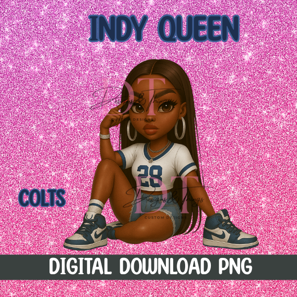 Rule the field with confidence and Colts pride using our Indy Queen PNG! Styled in bold blue and white with glam accents and royal attitude, this custom-designed queen is perfect for fans who want to stand out on game day. Use her to create stunning shirts, tumblers, mugs, and more for your football season lineup.