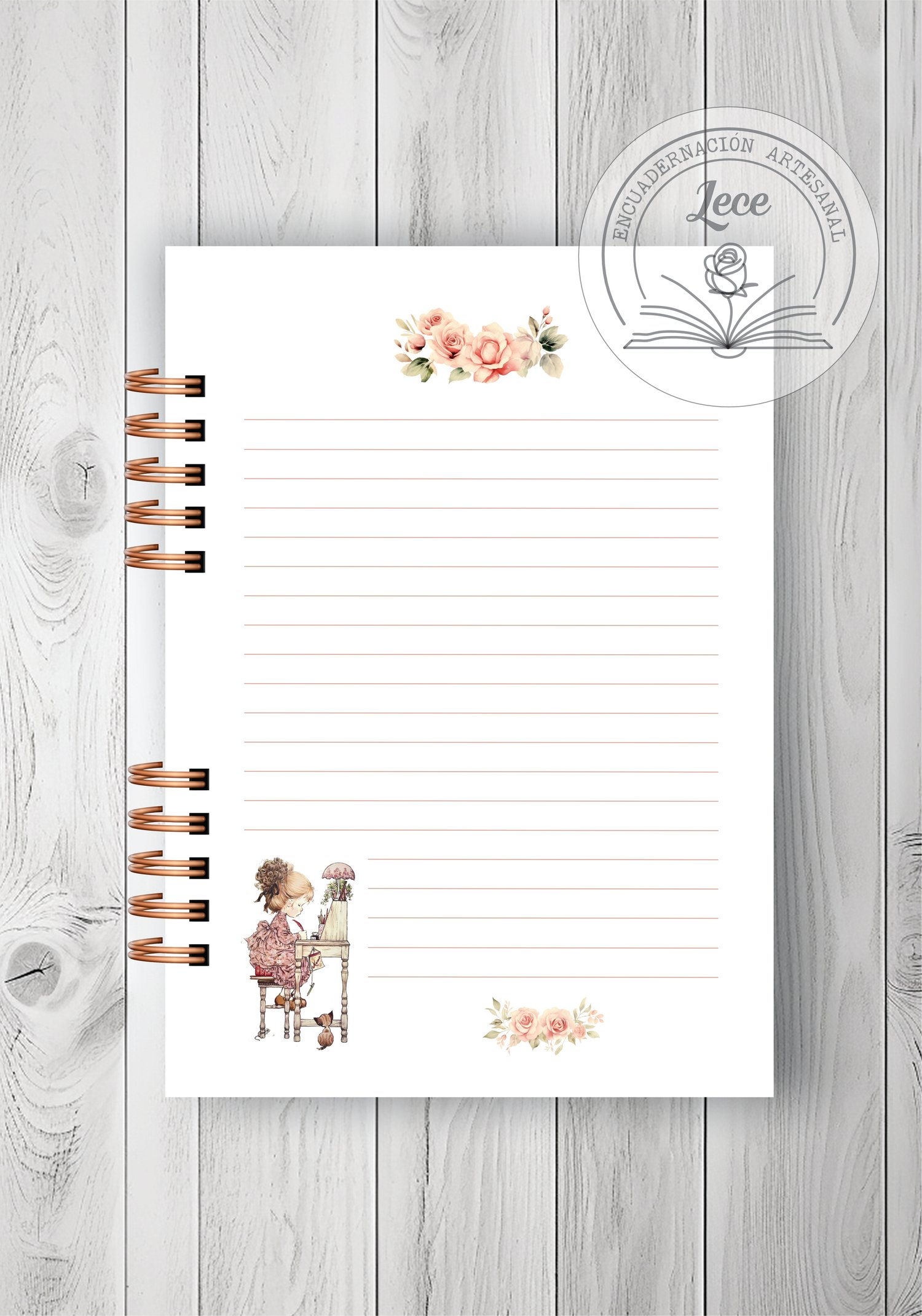 - 1 modelo de interior de 100 hojas rayadas con diseño según portadas y sus variantes para imprimir en tamaño A5 para anillado y costura.