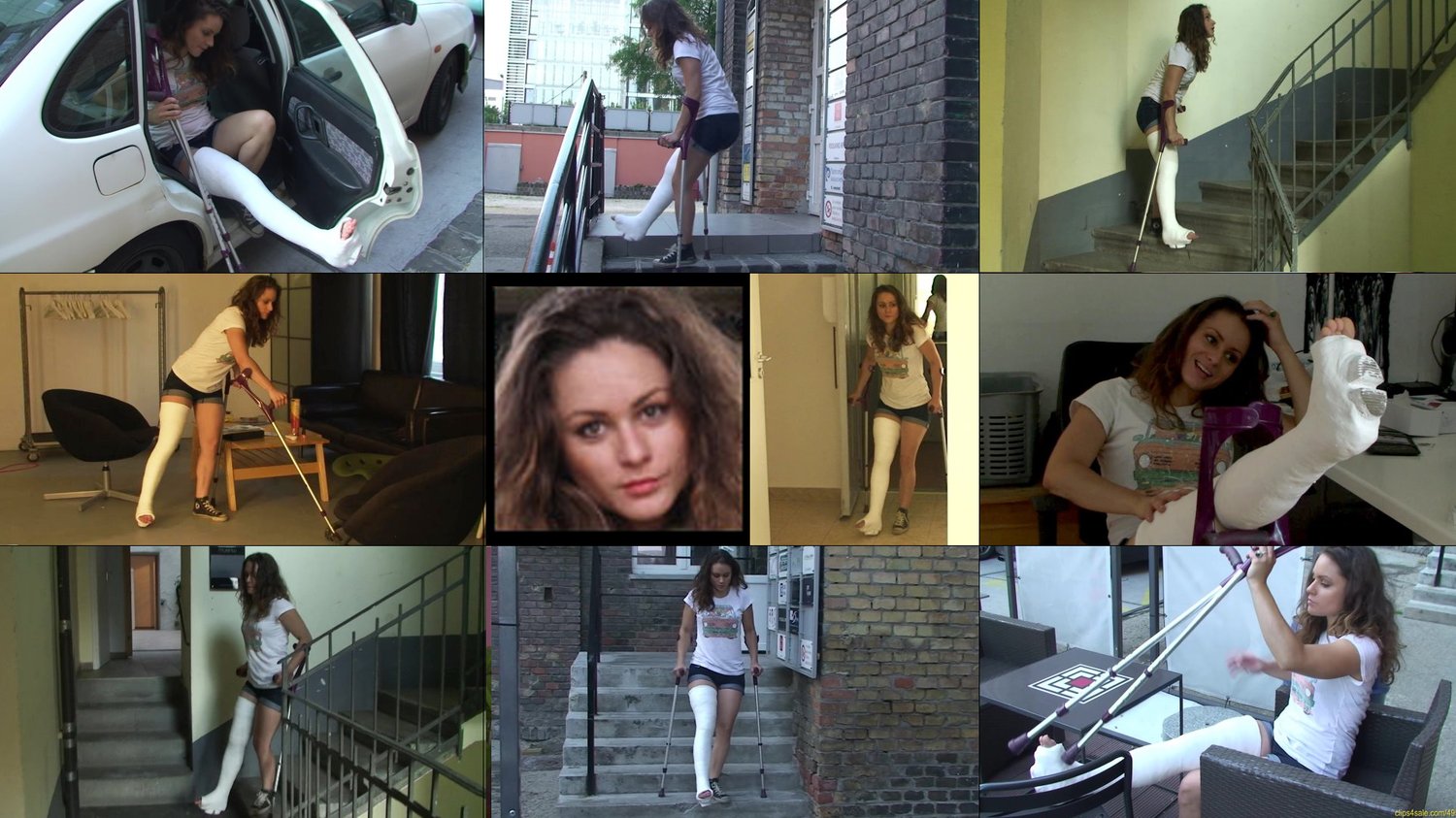 During the winter Nesty is driven to the park by her BFF to get some exercise in her cast and because its cold she puts a sock over her exposed casted toes. However as the clip opens and they get their her friend needs to help her adjust her crutches. As she crouches down her BFF gets a whiff of foot stink from the casted sock and pulls it also off Nesty's sock to air out her cast. Nesty allows it but soon its apparent her toes are freezing and her friend must stop to rub them. Its not enough and after a bit more crutching they end up on a bench with her first exhaling directly on her exposed foot to warm her toes while she massages them (closeups). She doesn't give her the stinky sock back though. After some time they continue Nasty's crutch in the park but her toes quickly get cold again and she needs to prop her foot up on a fountain so her friend can again rub her casted exposed toes (closeups).