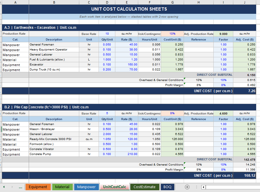 Unit Cost Calculation sheets break down each work item (e.g., excavation, concrete pouring, rebar installation) into its individual resource inputs. For each item, it calculates a fully loaded unit cost by stacking labor, material, and equipment costs, then adding overhead and profit margins. Production rates and contingency factors are also applied to reflect real-world conditions.