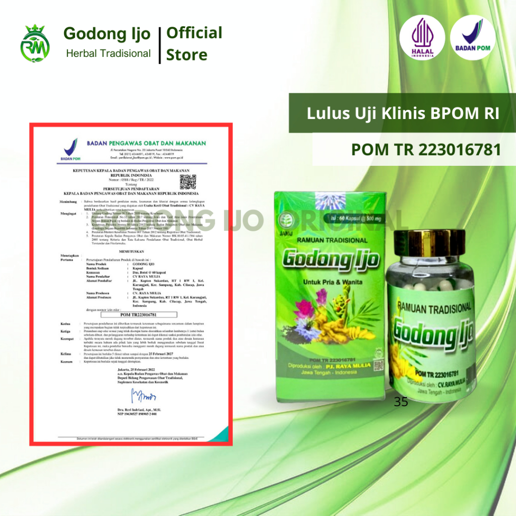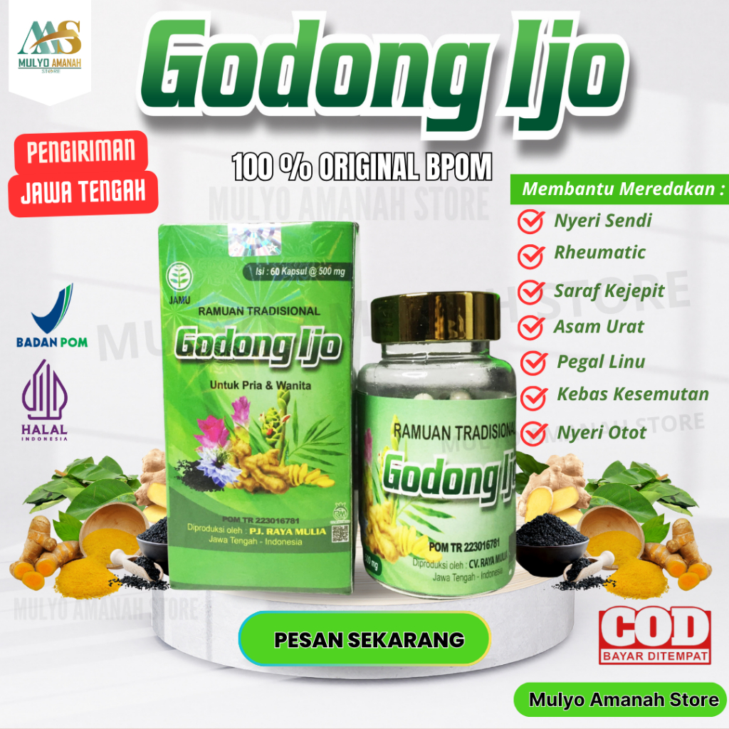 Original Godong Ijo Capsules for Joint Pain, Joint Pain, and Gout, produced by CV. RAYA MULIA. Guaranteed 100% Original, BPOM Official, POM TR