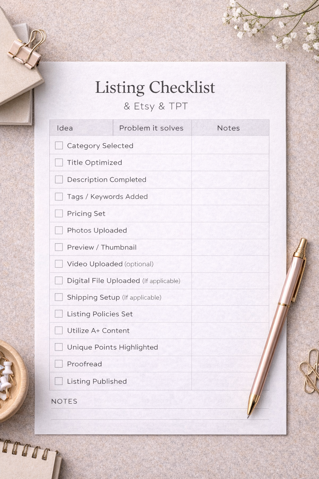 A clear and actionable checklist to optimize Etsy and TPT listings. Designed for digital sellers who want a simple system to publish products correctly and consistently.