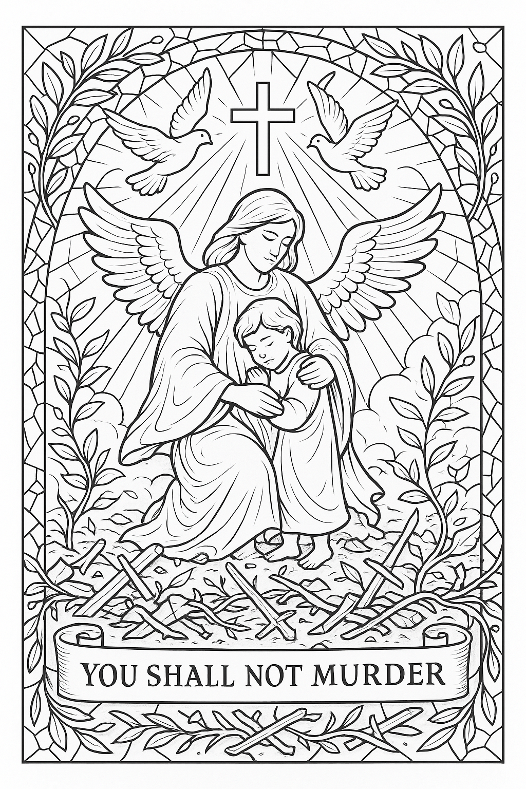 Honor the sacredness of life with this Sixth Commandment Coloring Page, featuring a guardian angel embracing a child in divine protection beneath a radiant cross. Surrounded by doves, leafy branches, and broken swords, this printable speaks to peace, mercy, and spiritual refuge β perfect for devotional kits, homeschool lessons, or ministry gifts.