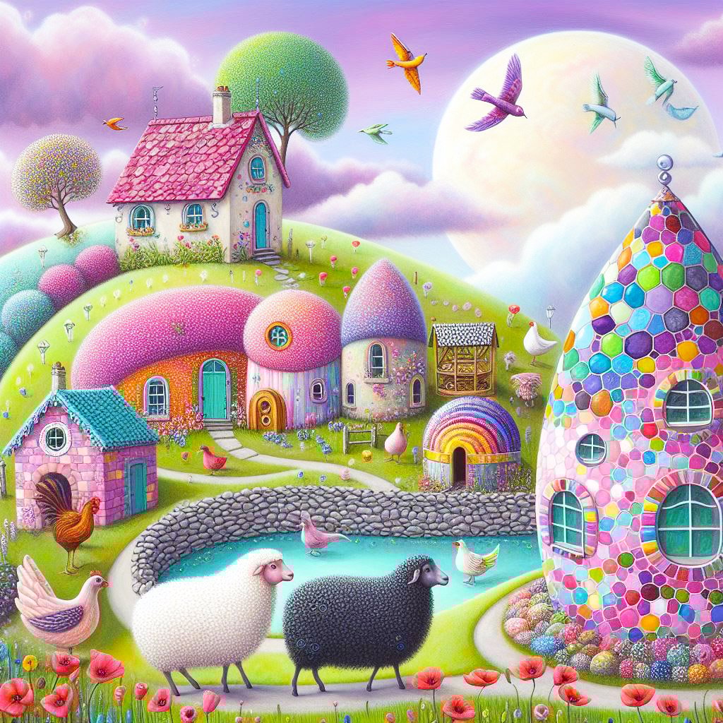 Quirky small half moon houses made of bright colourful tiny pink & blue bricks with mosaic glass tile roofs. A field with black curly sheep by a stone wall. Chickens & a fancy coup. There are poppies everywhere. A wishing well, pond & twisty trees, with glass bird houses & there are humming birds.