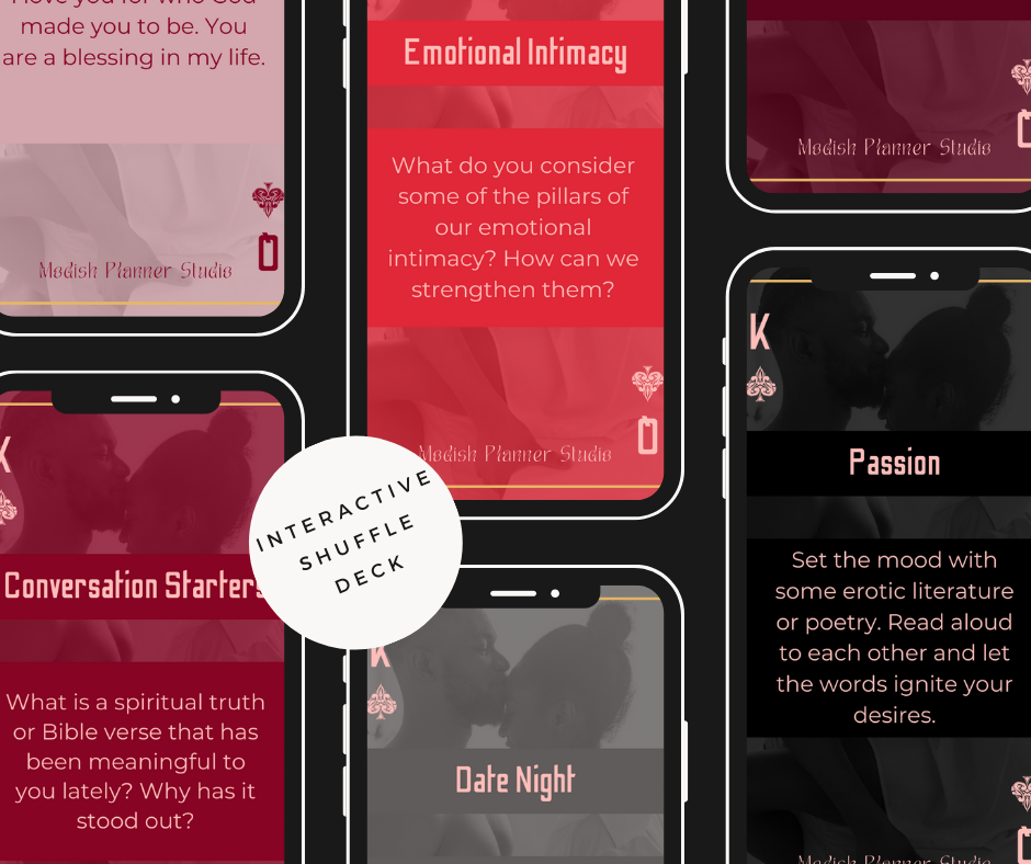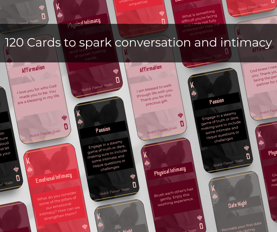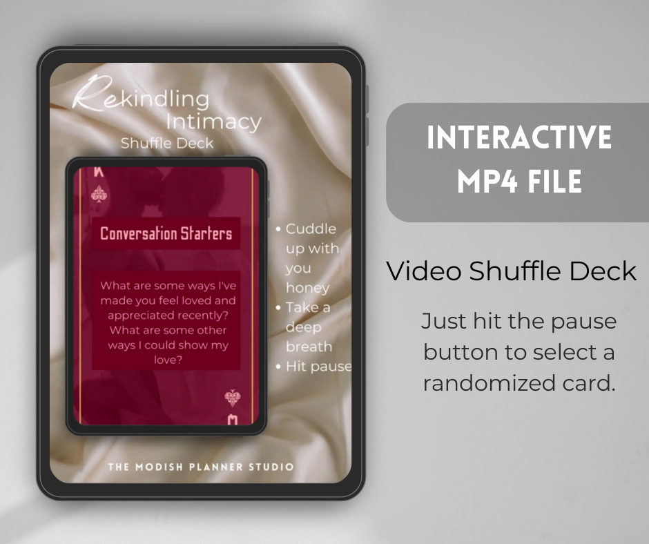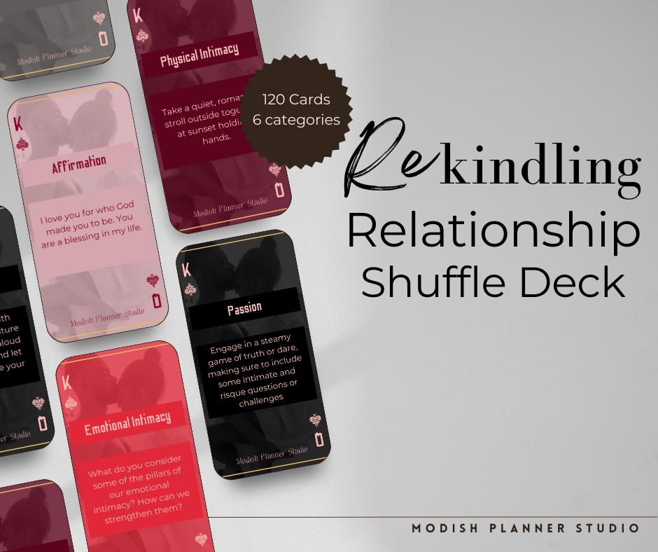 Spice up your love life with our dynamic "Rekindling Relationship Shuffle Deck" - the ultimate game for deepening connections and sparking passion! πβ¨ This innovative digital deck, featuring 120 cards across six categories, brings a new level of excitement to your relationship journey.