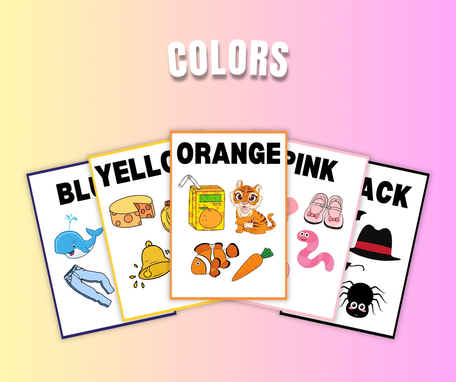 ✅ 10 Flashcards (Red, Orange, Blue, Yellow, Green, Purple, Black, Brown, Gray, Pink)