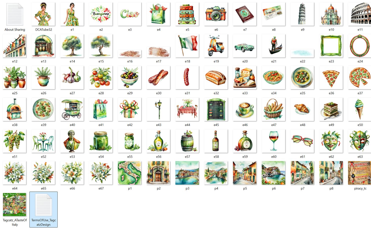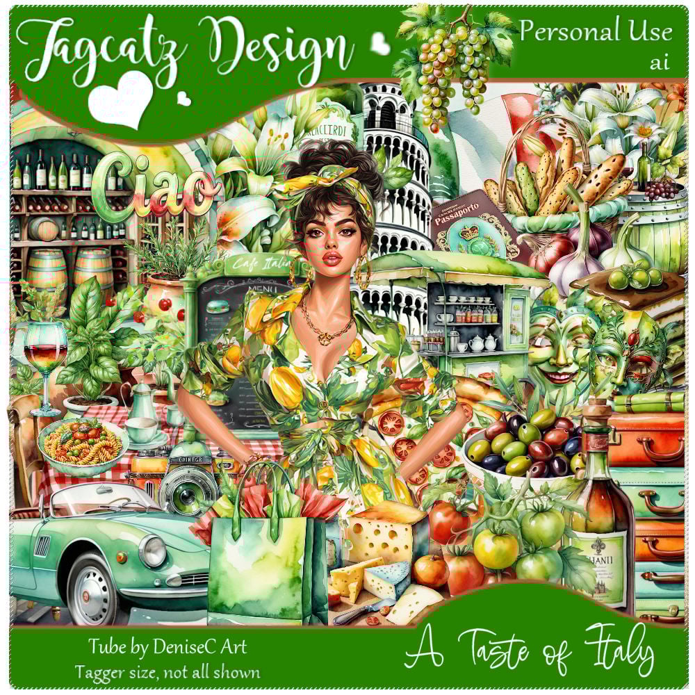 A little taste of Italy, food, attractions and more. Tube by DeniseC Art is included. 67 elements and 8 matching papers. Tagger size. Not all shown. Personal use only.