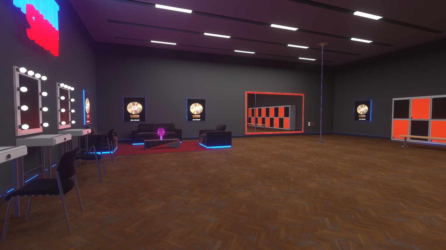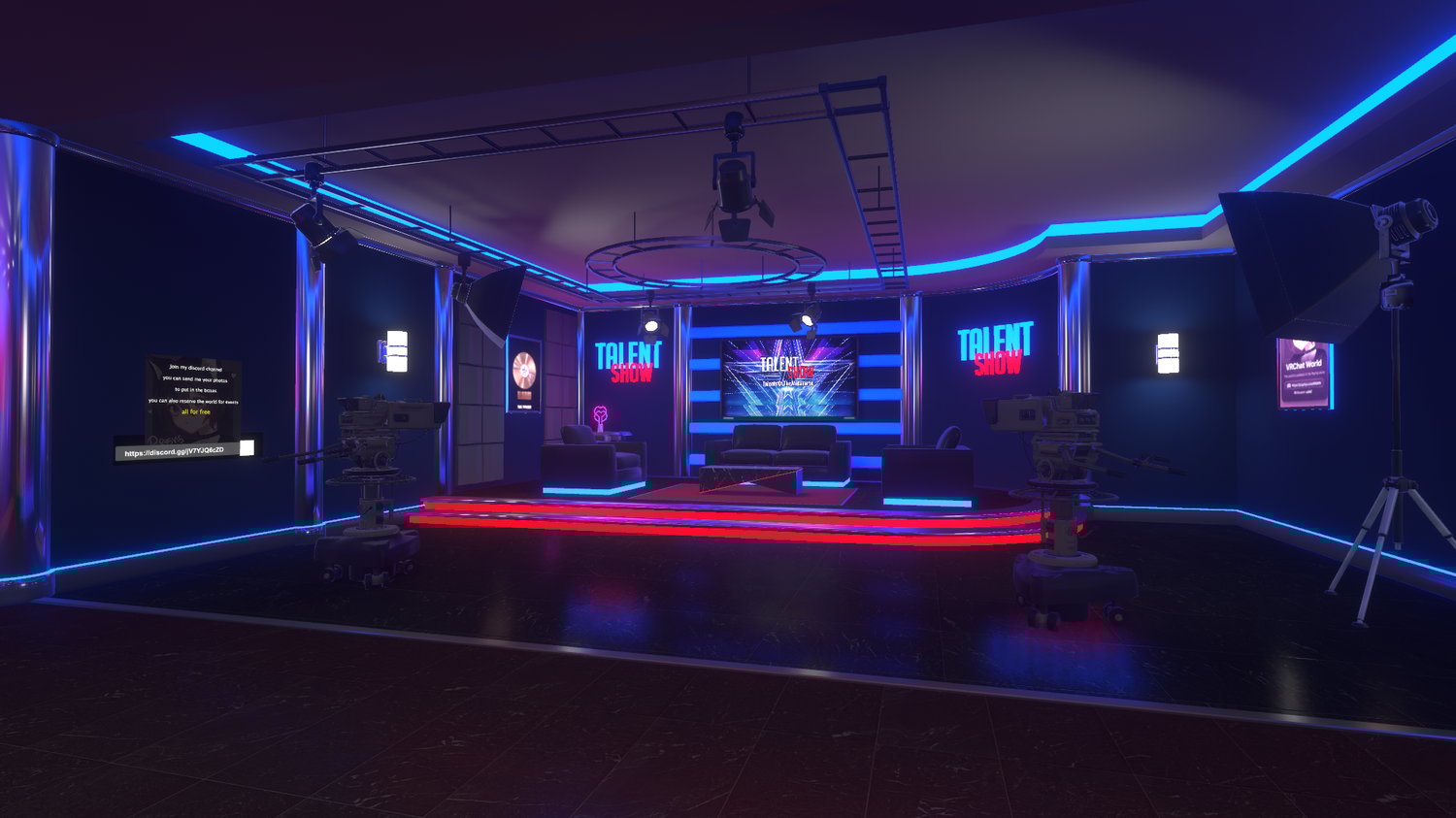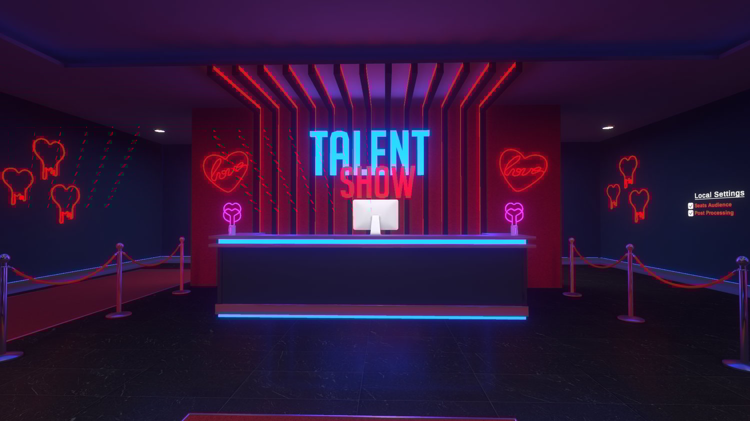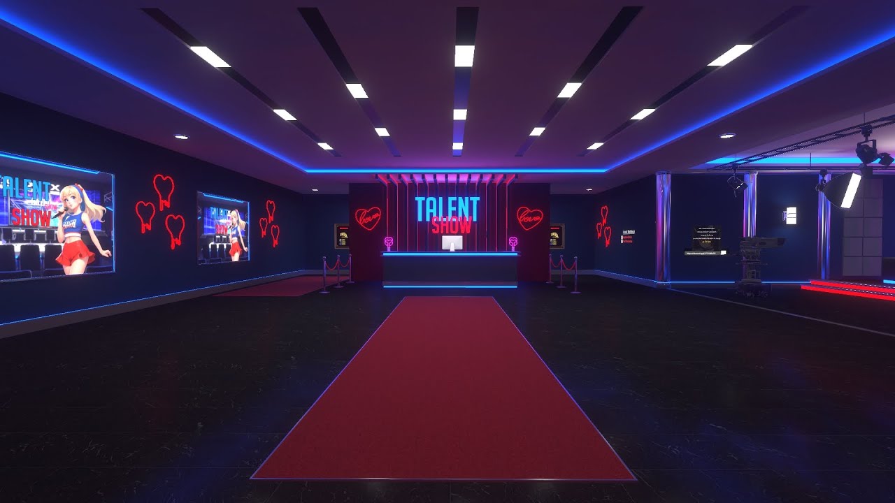 Talent Show is a world for competition and events in vrchat, it has an entrance lobby and two backstages, one separated from the map for greater privacy, and another right behind the stage.