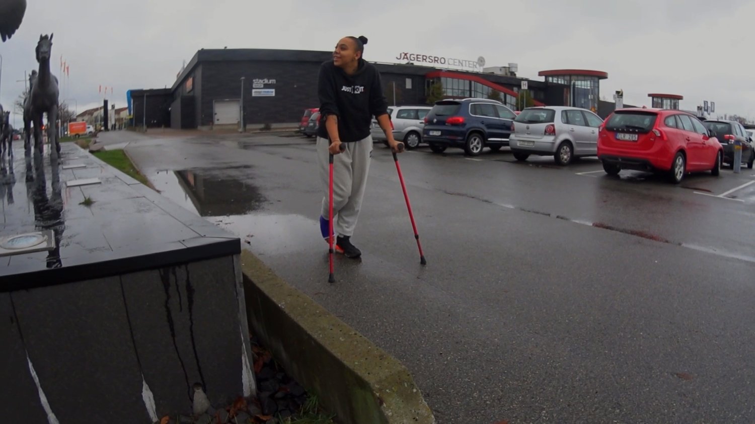 Todays focus is on Sassy and her blue SLC on the right leg.She’s crutching into a little mall together with her friend but gets to lead the way, like that she can be the one choosing in what pace we’ll be walking. But it turns out Sassy wasn’t very interested in looking at anything today as she’s still is in pain and just wants to get back home again. Follow her as she struggles to get back to the car and has to stops repeatedly on her way to breathe. Her arms must be hurting a lot. A broken foot surely does not help either! You can see in her face when she stops for a quick second- that she’s struggling. Come on Sassy, it’s not much left to the car now. Follow by as we root for her while getting a nice view of her blue casted foot in the back, every minute counts!