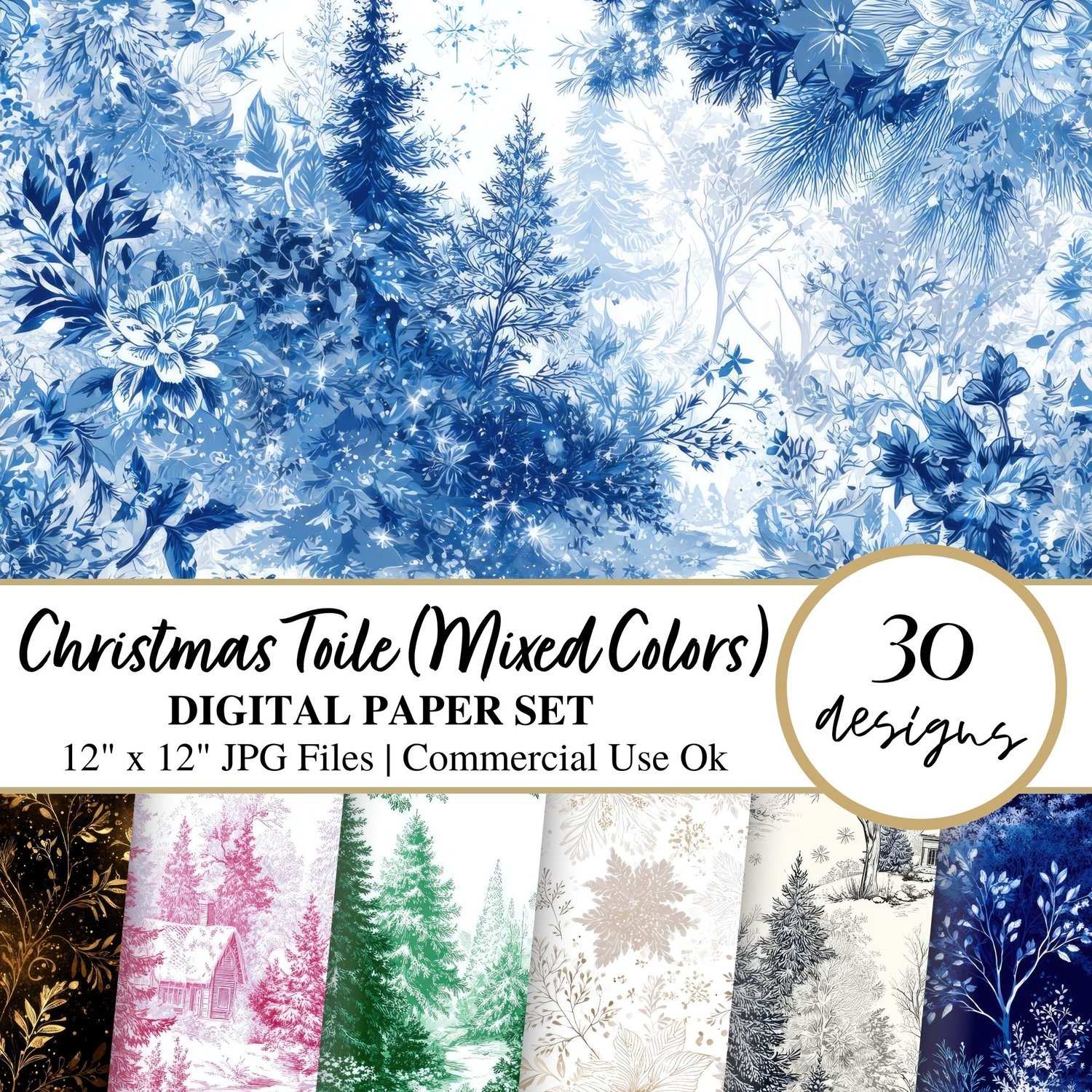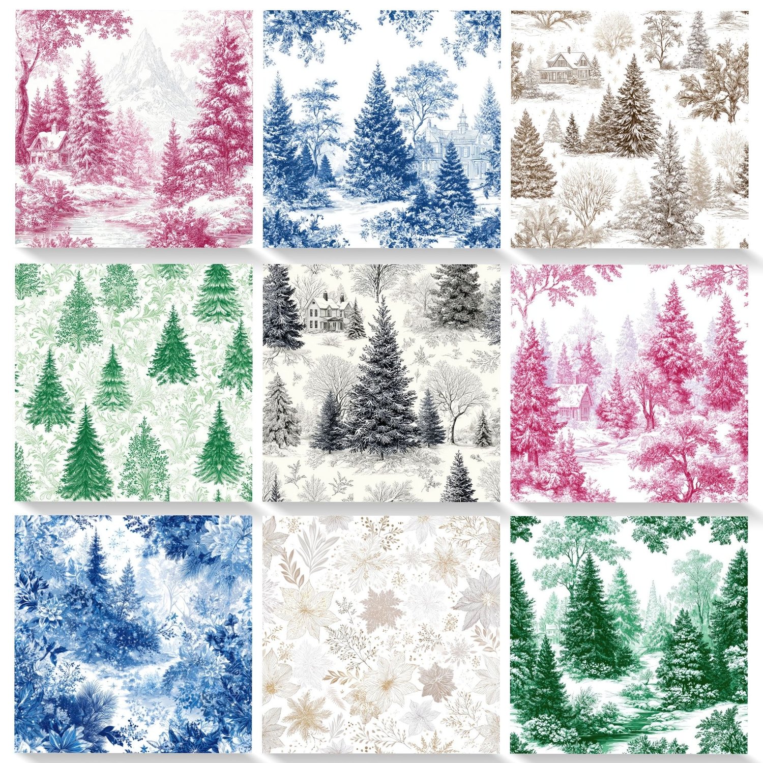 Bring vintage charm and timeless elegance to your holiday projects with this Mixed Color Christmas Toile Digital Paper Pack. This sampler set includes 30 beautifully detailed designs in a variety of rich colorways: from soft neutrals and deep greens to classic blue, burgundy, and black-and-white toile. Each 12x12" background features traditional winter scenes with snowy trees, cottages, deer, and florals, blending cozy nostalgia with sophisticated artistry.