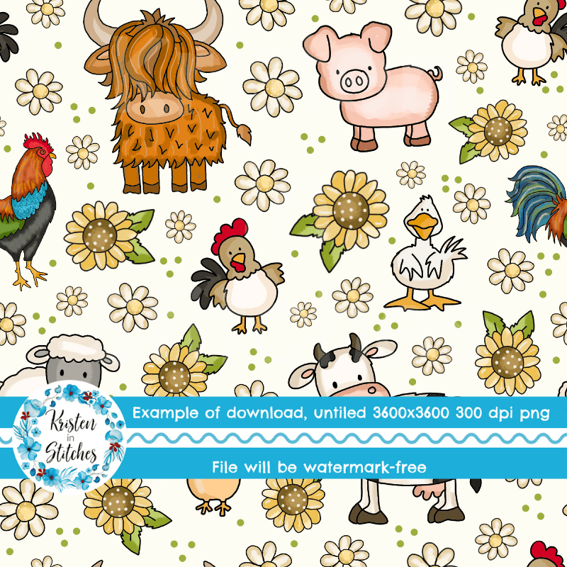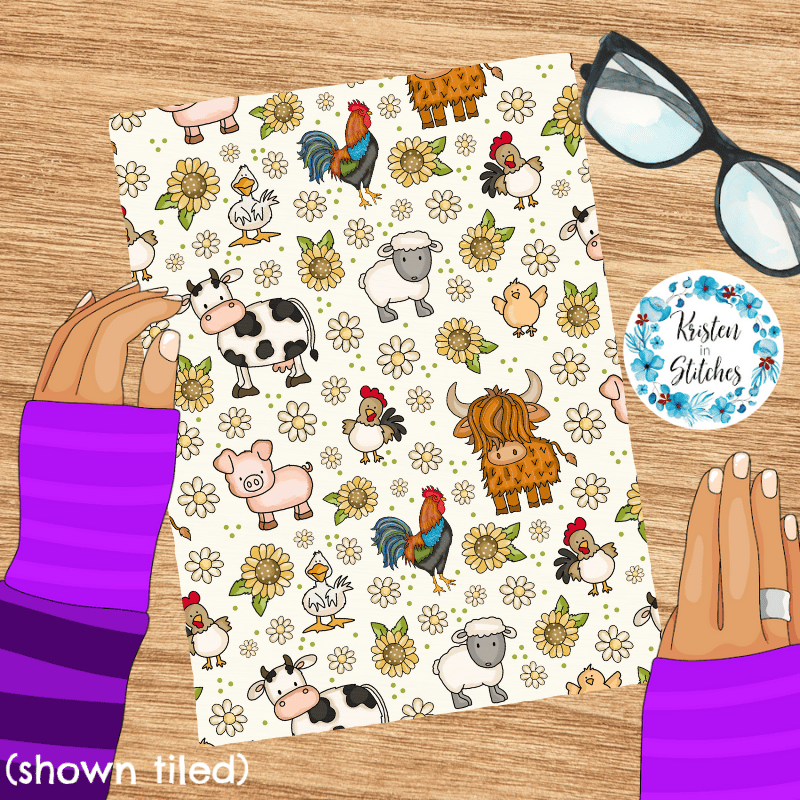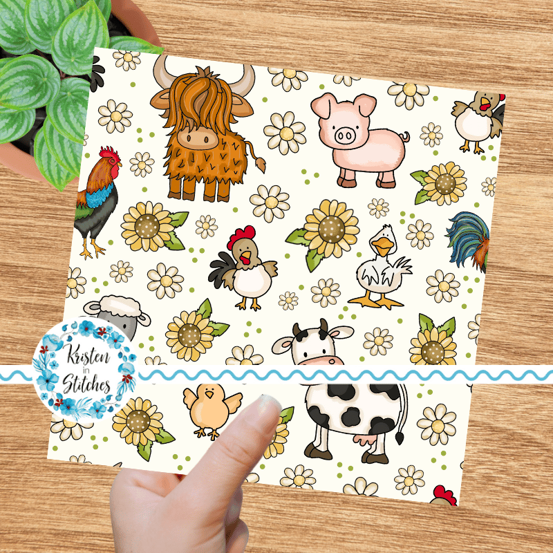 Barnyard animals, sunflowers and daisy flowers.