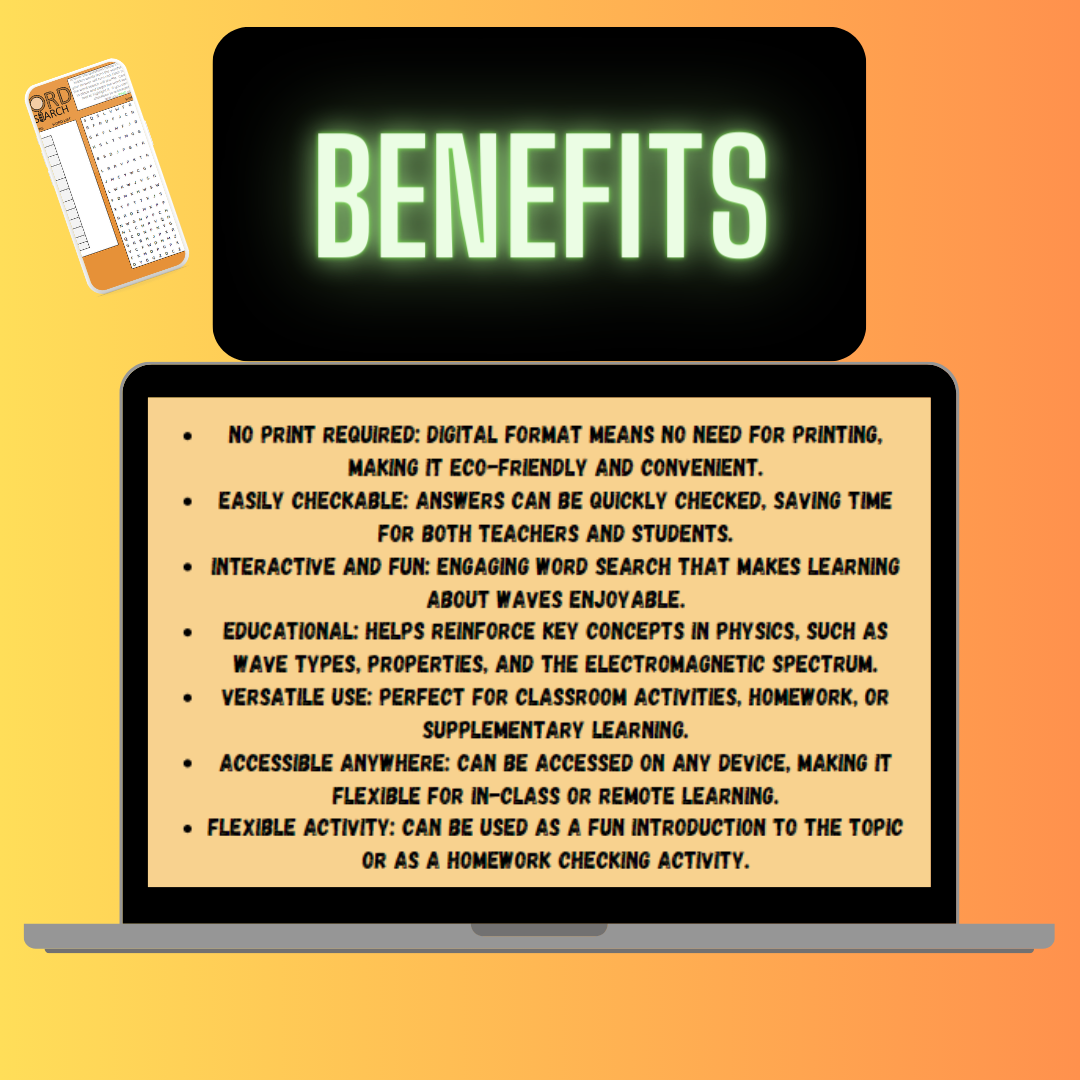 Engage your students in the fascinating world of waves with our "Wave Wonders: Physics Waves Word Search." Ideal for grades 8-9, this digital activity makes learning about waves interactive and enjoyable.