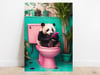 Bring bold color and whimsical charm to your space with this unique digital art print featuring whimsical animals casually in a retro-style bathroom.