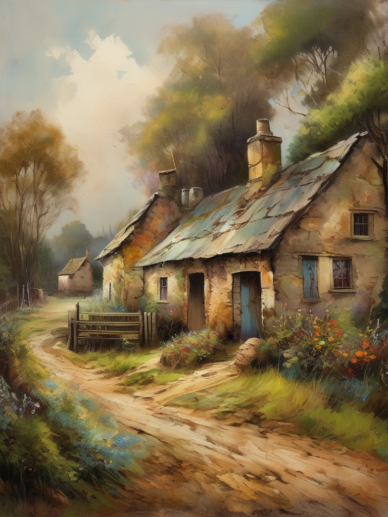 The old British countryside, a work of wall art dating back to 1960, with all its details and colours. The farm is an old oil painting in faded oil colours.png