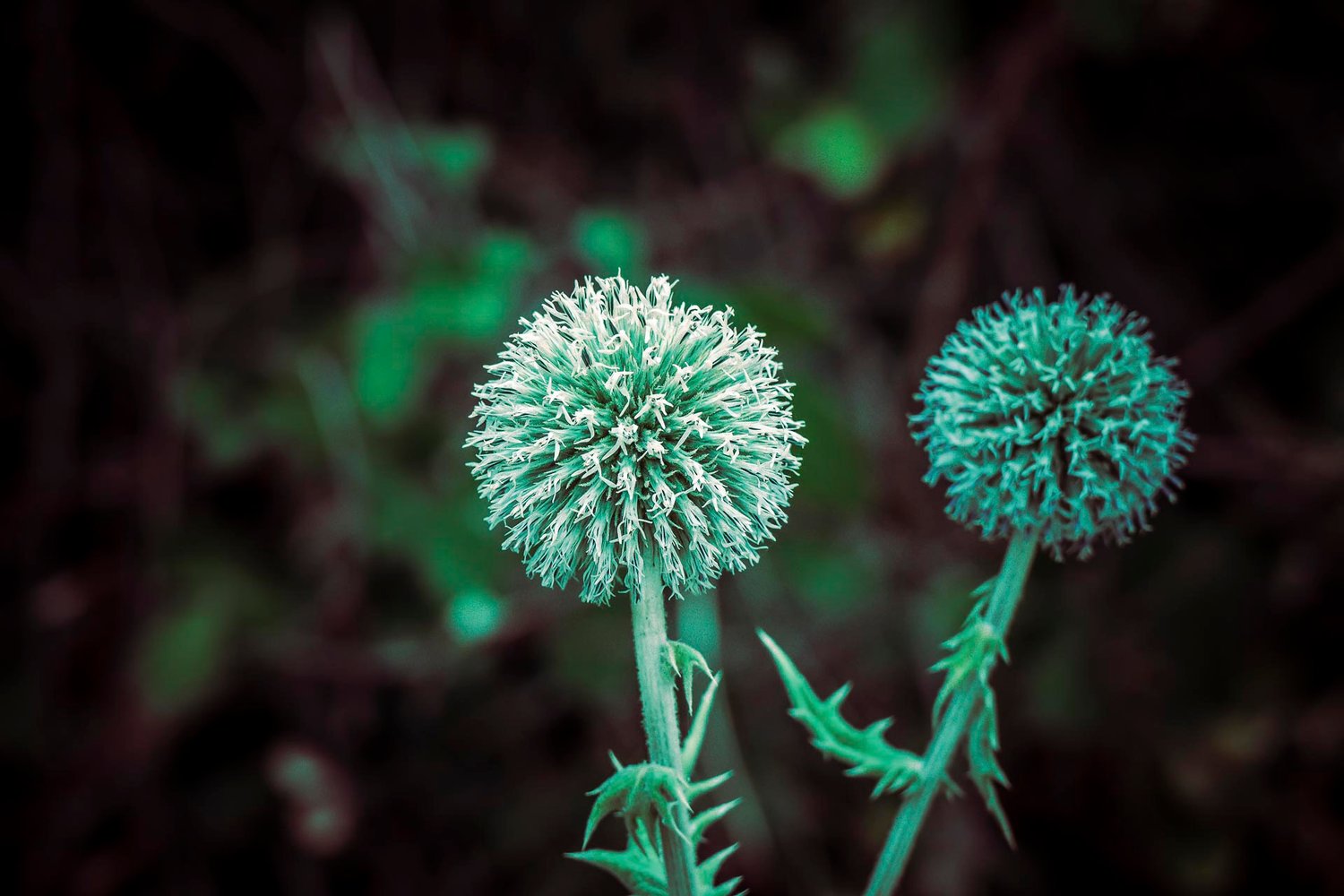 Macro photography of a globe thistle (echinops sphaerocephalus), on a dark background and out of focus to highlight the plant. The original color has been modified towards green to give it more freshness and joy.