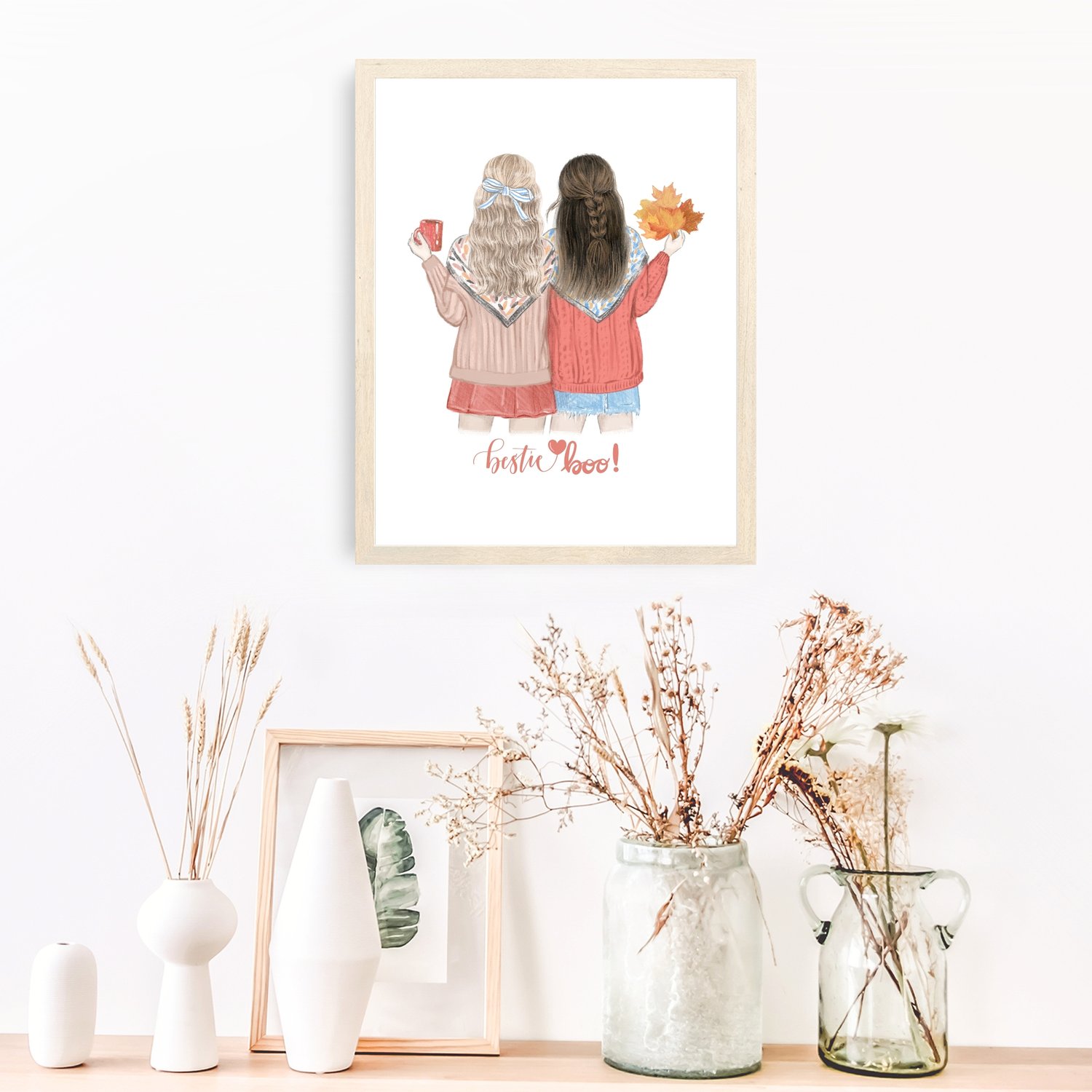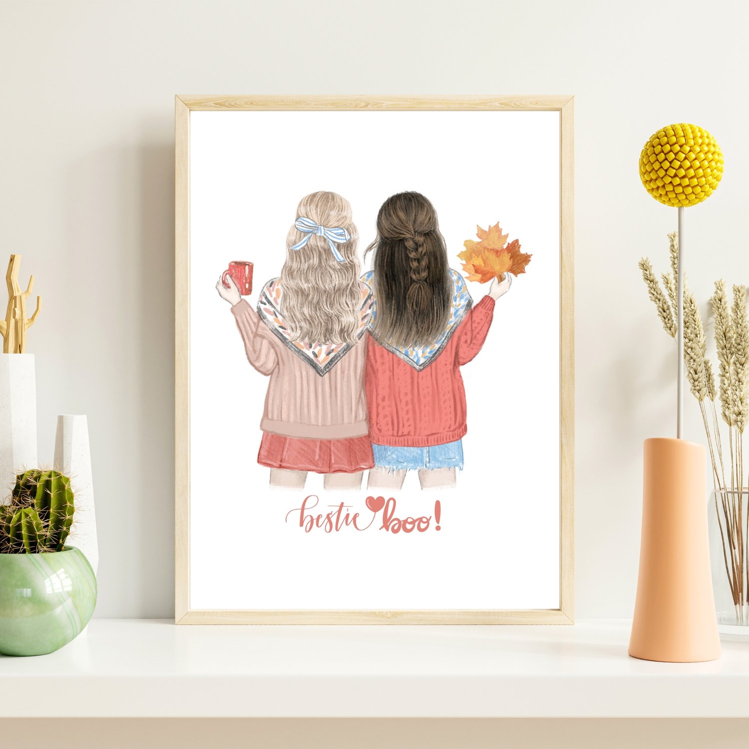 Celebrate the joy of friendship with "Bestie Boo," a custom best friend portrait that captures the warmth of your special bond. This delightful faceless art piece is the perfect personalized friendship gift, featuring a charming fall theme with cozy sweaters and seasonal accents. 🍁 Choose from a variety of custom nicknames, or add your own custom names, nicknames, and even quotes to make it truly unique! 💖 Ideal for birthdays, anniversaries, or just because, this bestie illustration adds a touch of love and joy to any space. With its chic and minimalistic design, this wall art serves as a beautiful reminder of the cherished moments shared between friends. Give the gift of elegance and sentiment with this stunning custom faceless portrait. 🌟🍂
