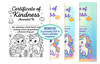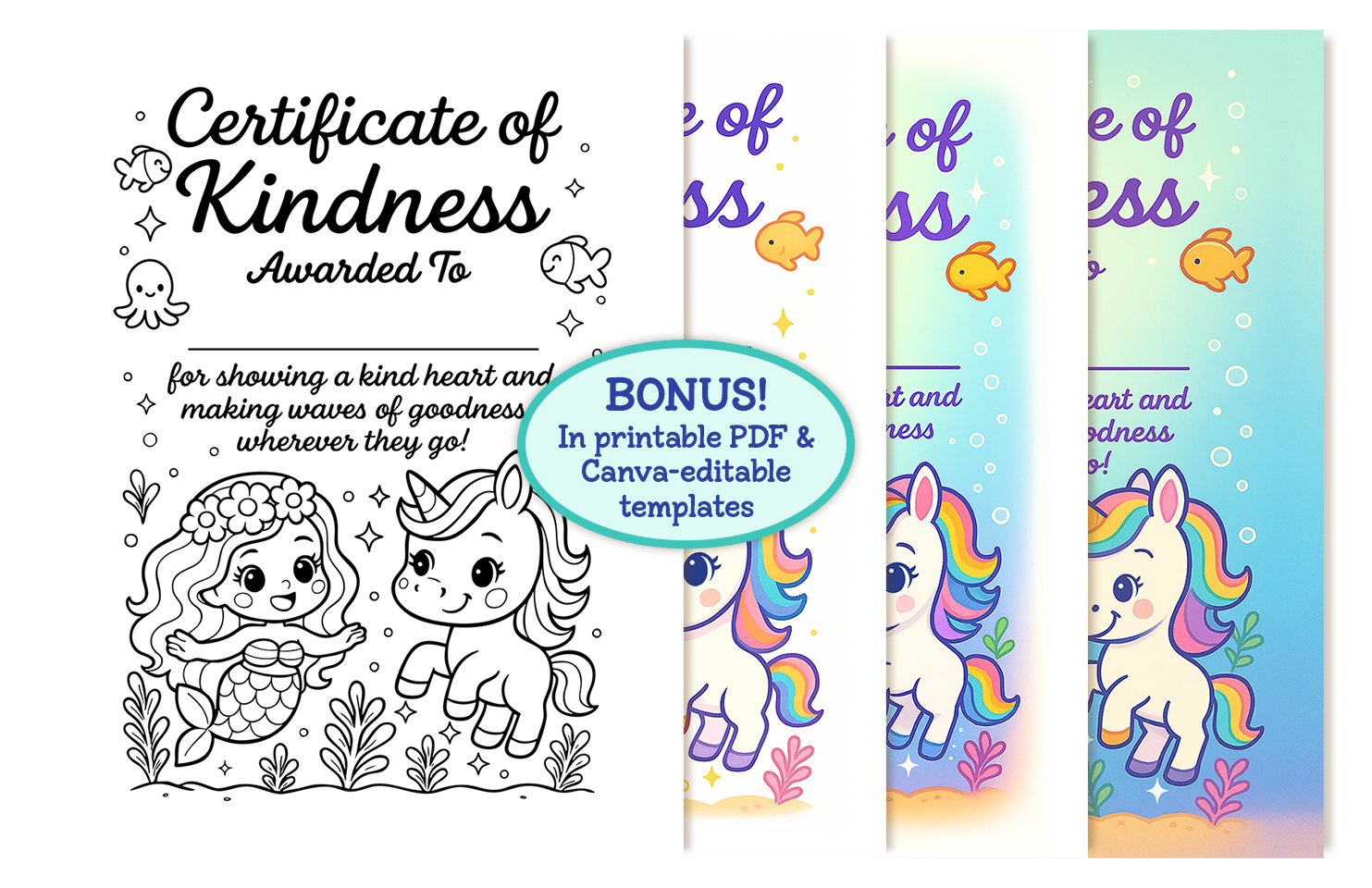* Certificates of Kindness in PDF and as Canva-editable templates. In letter paper size (8.5" x11"), in 4 color schemes: color-me black and white, white background with colored graphics, fade to white (vignette) background, and full color. Celebrate your little one’s big heart with this sweet reward for spreading kindness and making the world a brighter place.
