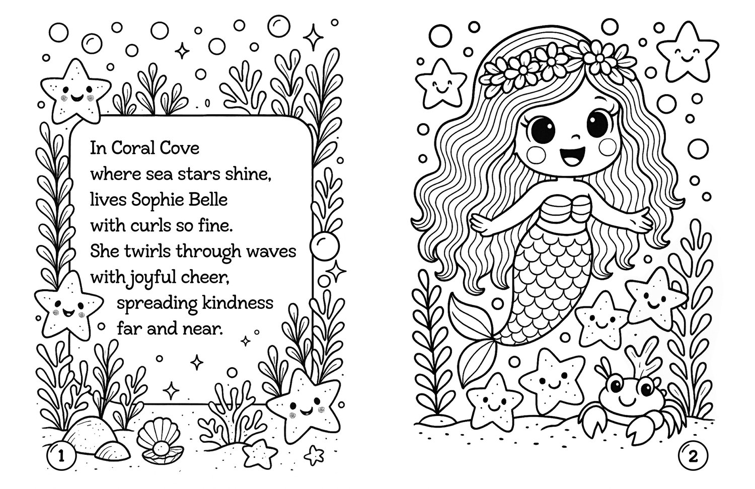 This printable coloring storybook follows Sophie Belle, a bubbly little mermaid, and her sparkly unicorn best friend, Twinklehoof, on an underwater adventure filled with giggles, rhymes, and gentle life lessons. Each story page is paired with a matching coloring page to engage creativity while reinforcing values like good manners, helpfulness, and caring for others.