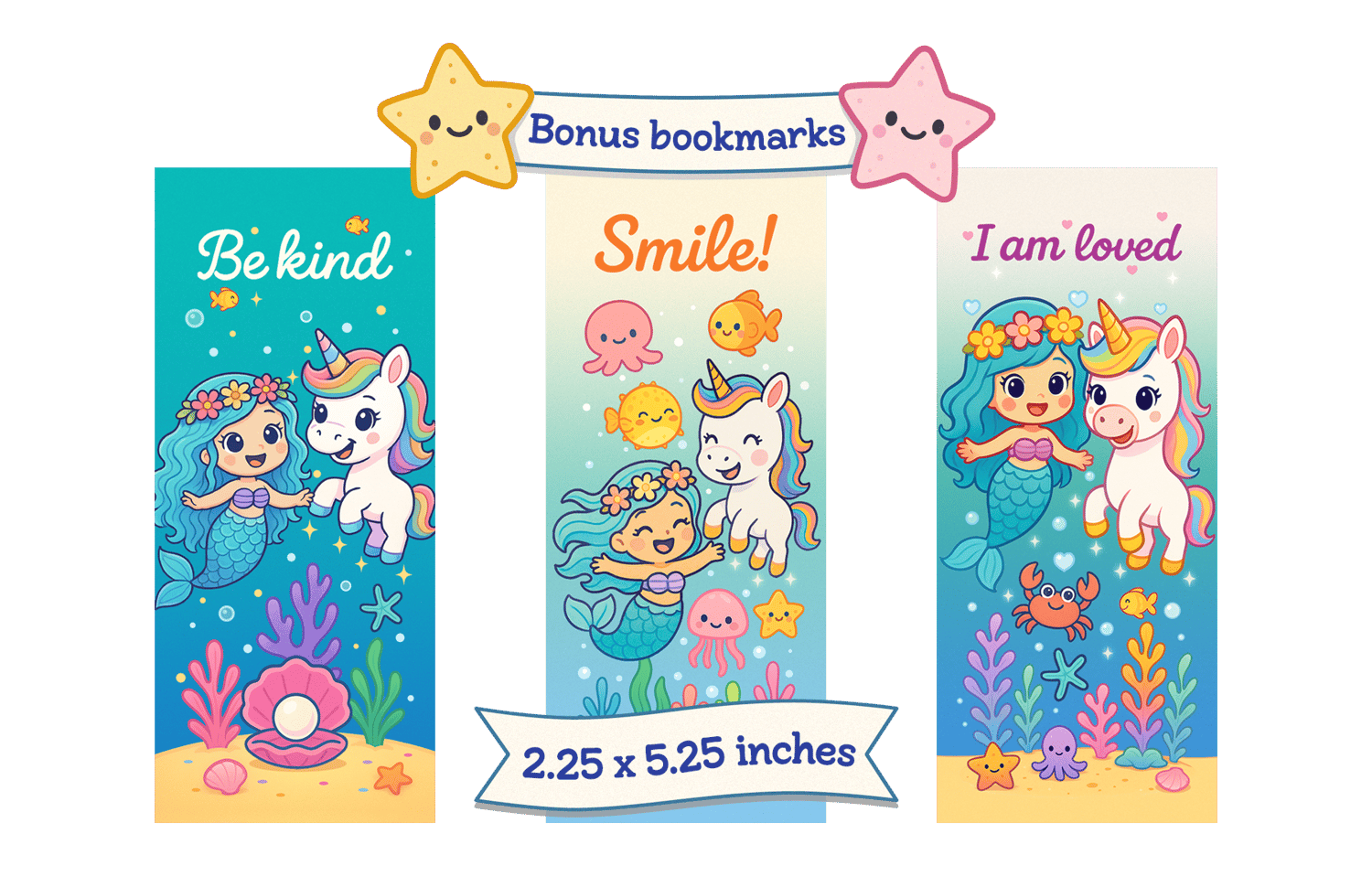 * Set of 3 bookmarks (2.25x5.25 inches). Perfect for brightening reading time with kind words and happy underwater vibes.