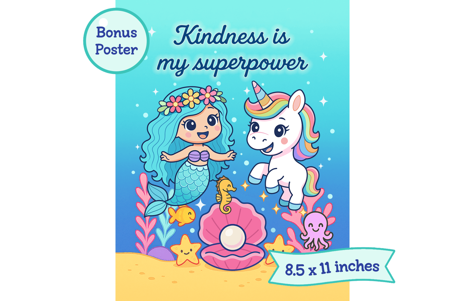 * “Kindness is my superpower” poster in letter paper size (8.5" x11"). Add a splash of magic to any room or desk with this cheerful reminder that kindness makes you truly shine.