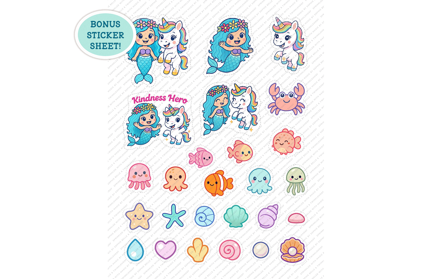 * 1 sheet (26 pieces) of underwater-themed stickers with Sophie Belle and Twinklehoof, hearts, shells, sea creatures and more, perfect for tracking habits, boosting motivation, or just adding joy to the day!