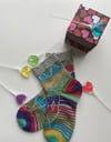 Confetti Hearts is a charted slip-stitch mosaic sock pattern consisting of an 8-stitch repeat. The pattern is written for toe-up socks using magic loop with an afterthought heel. Other heel styles can be substituted to create a sock with a flattering fit.