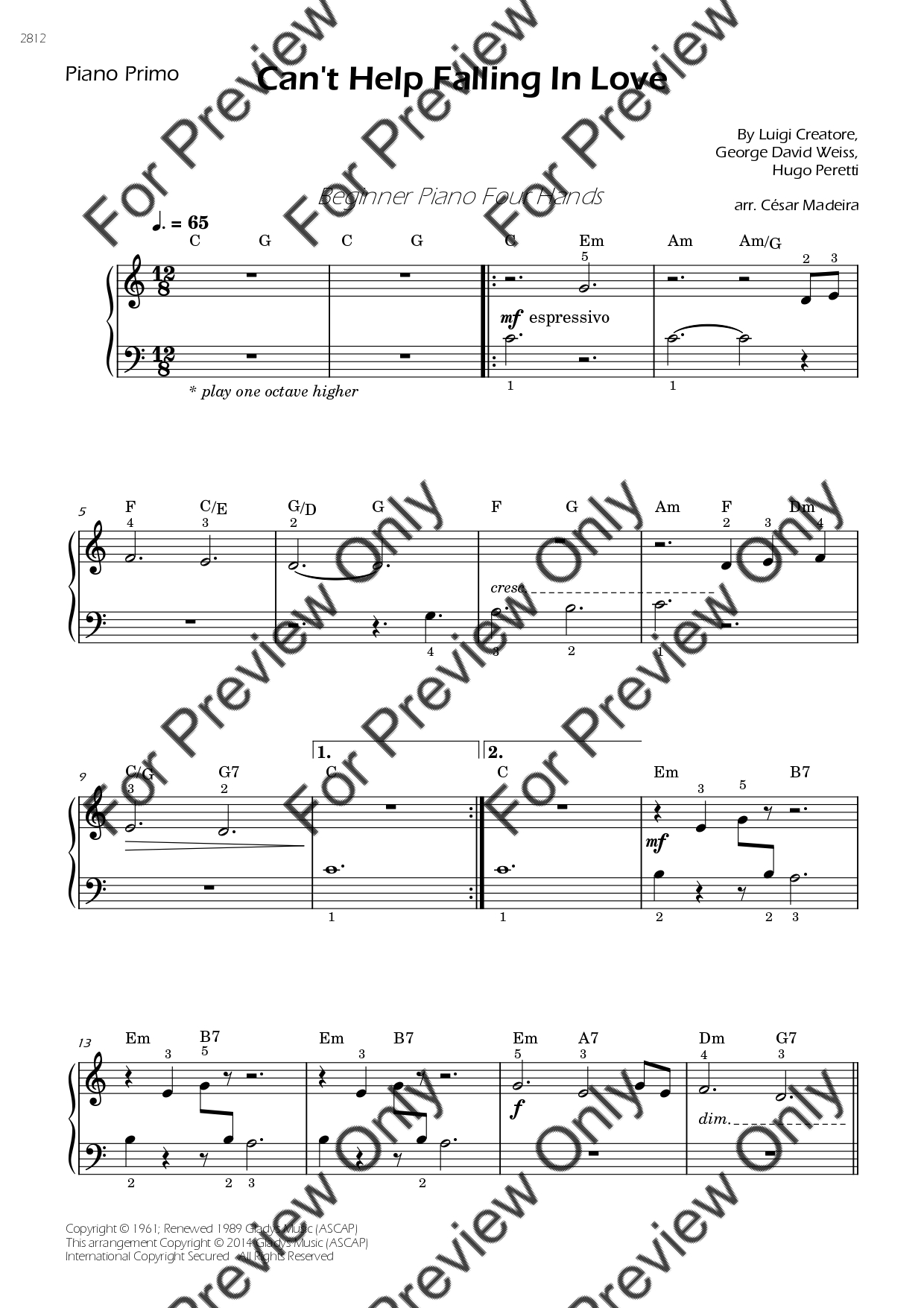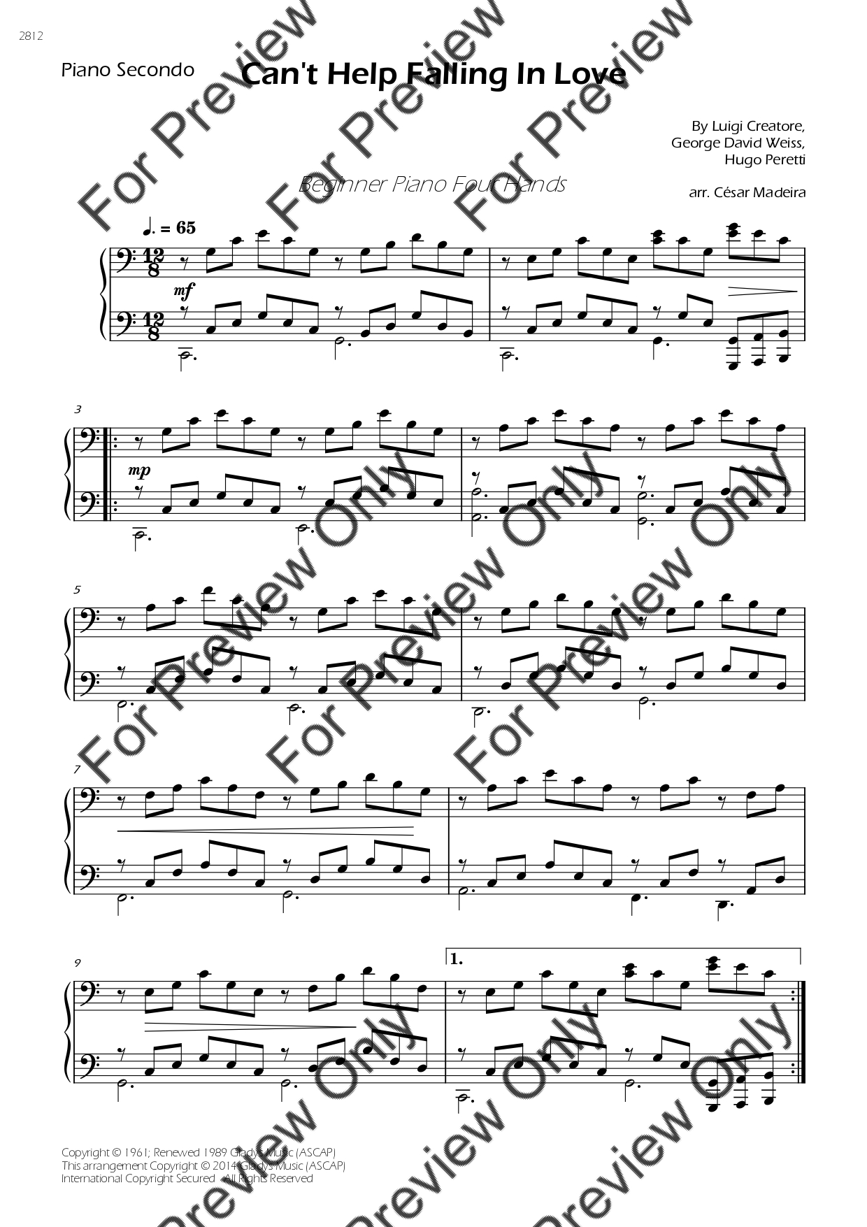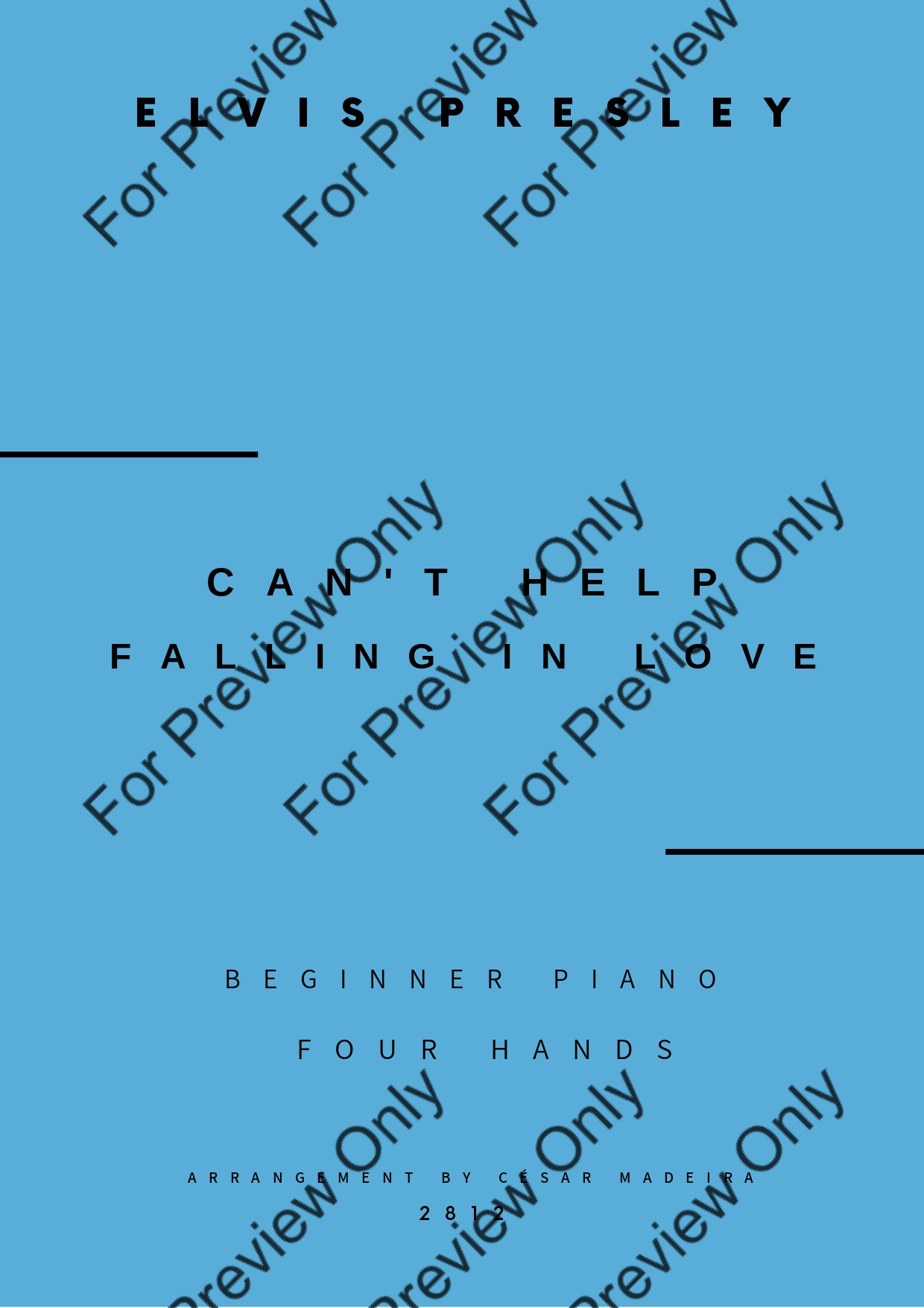 Can't Help Falling In Love by Elvis Presley. Arrangement for Beginner/Easy Piano Four Hands. With Full Score and Individual Parts. Have fun!