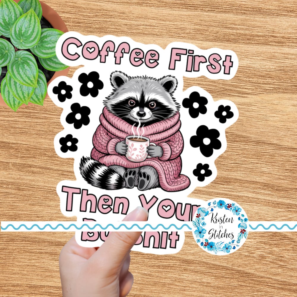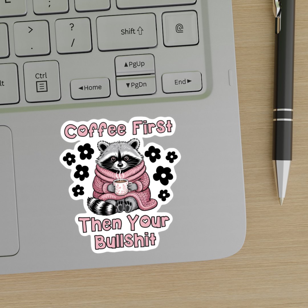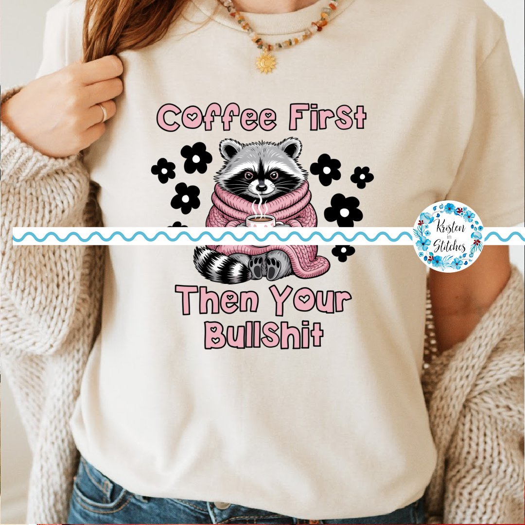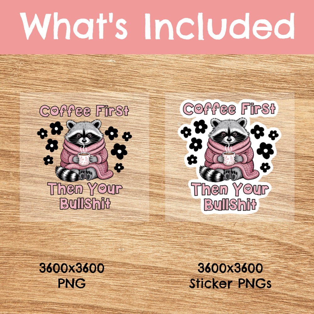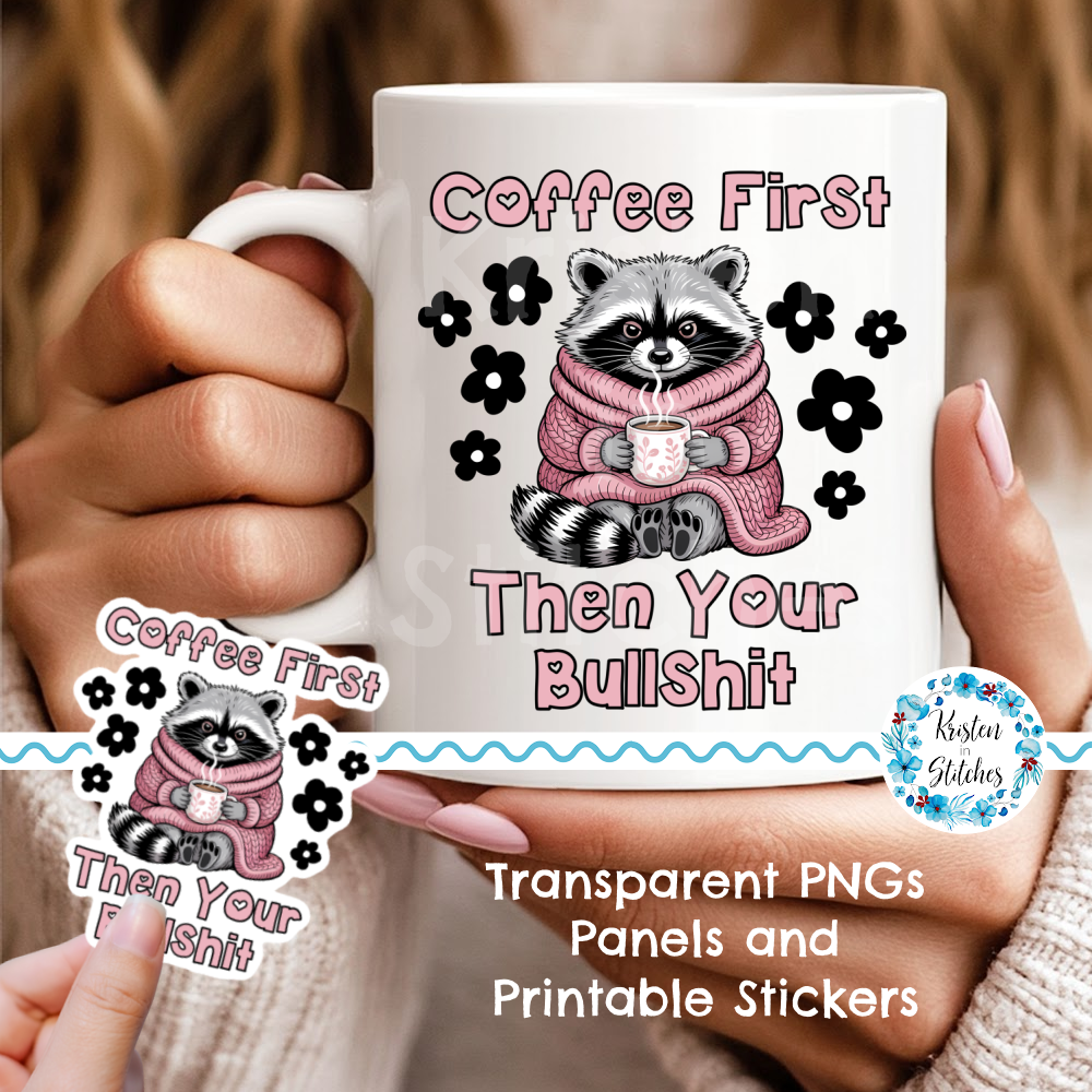 Coffee First, Then Your Bullshit funny raccoon graphics. Use for stickers, badge reels, jar and candle labels, uv dtf transfers, shirts, digital journals and so much more!
