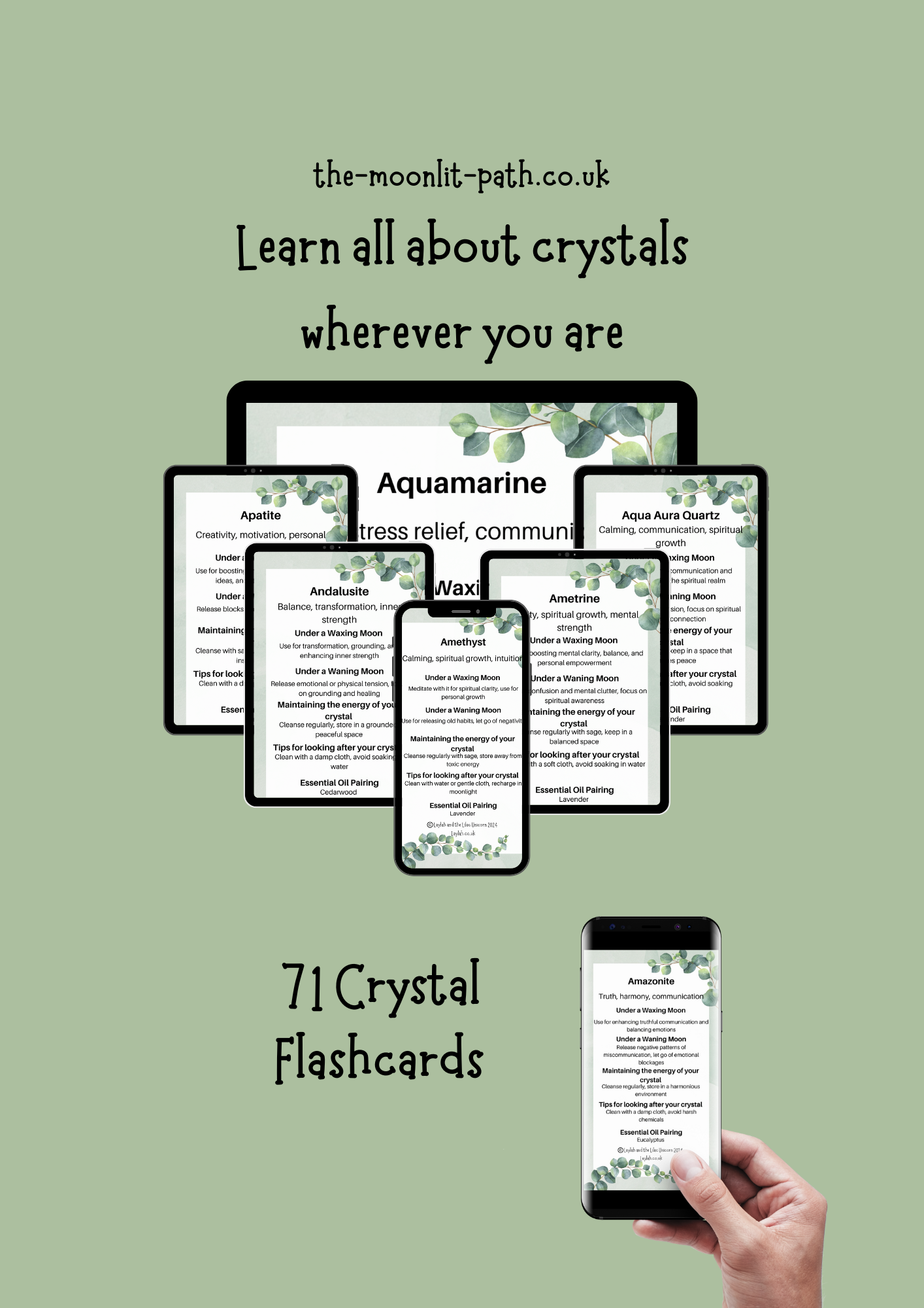 Discover the ultimate crystal companion—a set of 71 beautifully designed flashcards that bring the magic of crystals to life! Perfectly tailored for crystal enthusiasts and moon lovers alike, this exclusive digital collection offers: