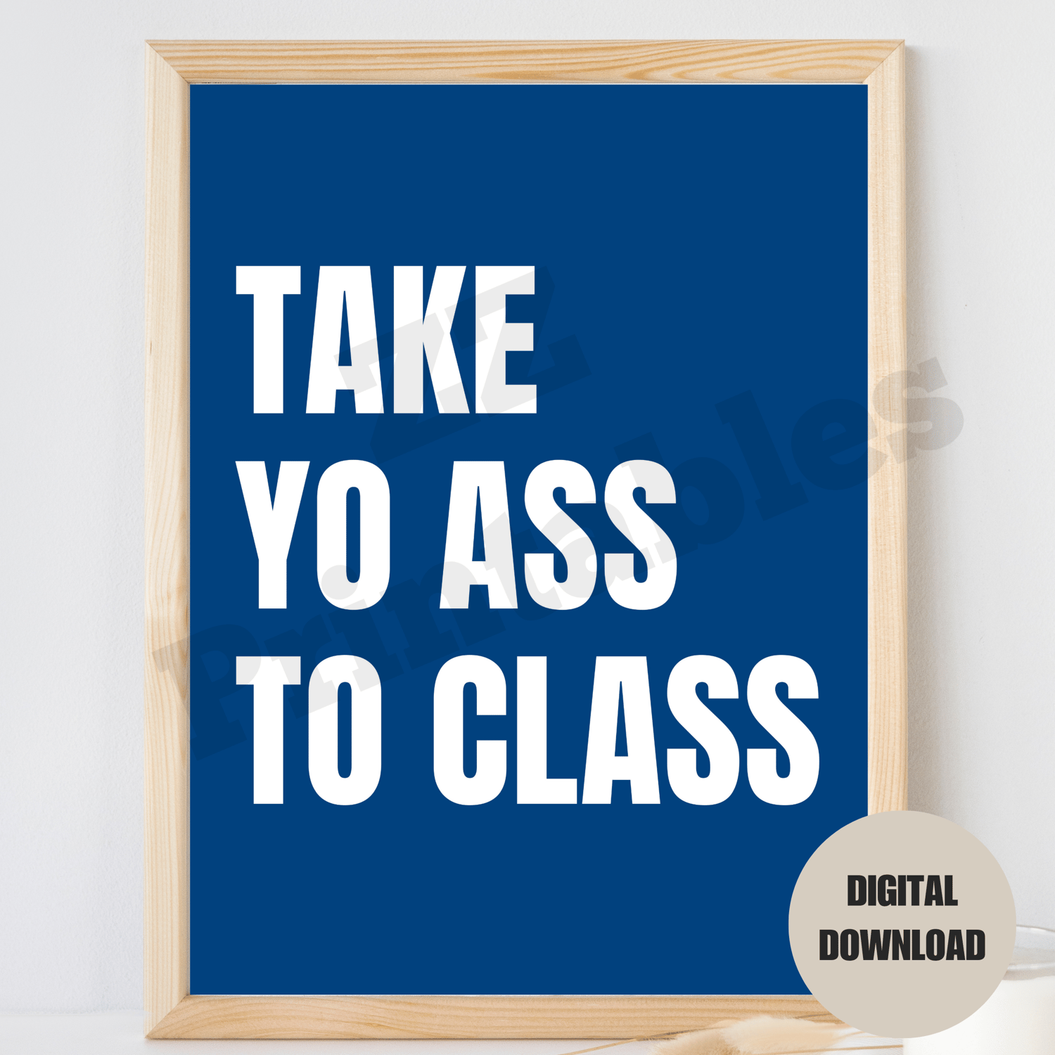 Take Yo Ass To Class print preppy college student motivational quote poster blue white dorm decor printable wall art digital download. The funny no-nonsense saying comes in 5 different sizes. The digital download consists of a zipped file containing 5 high quality JPEG files (300 dpi) and a PDF size chart to help you choose the right file for the printing size you want.