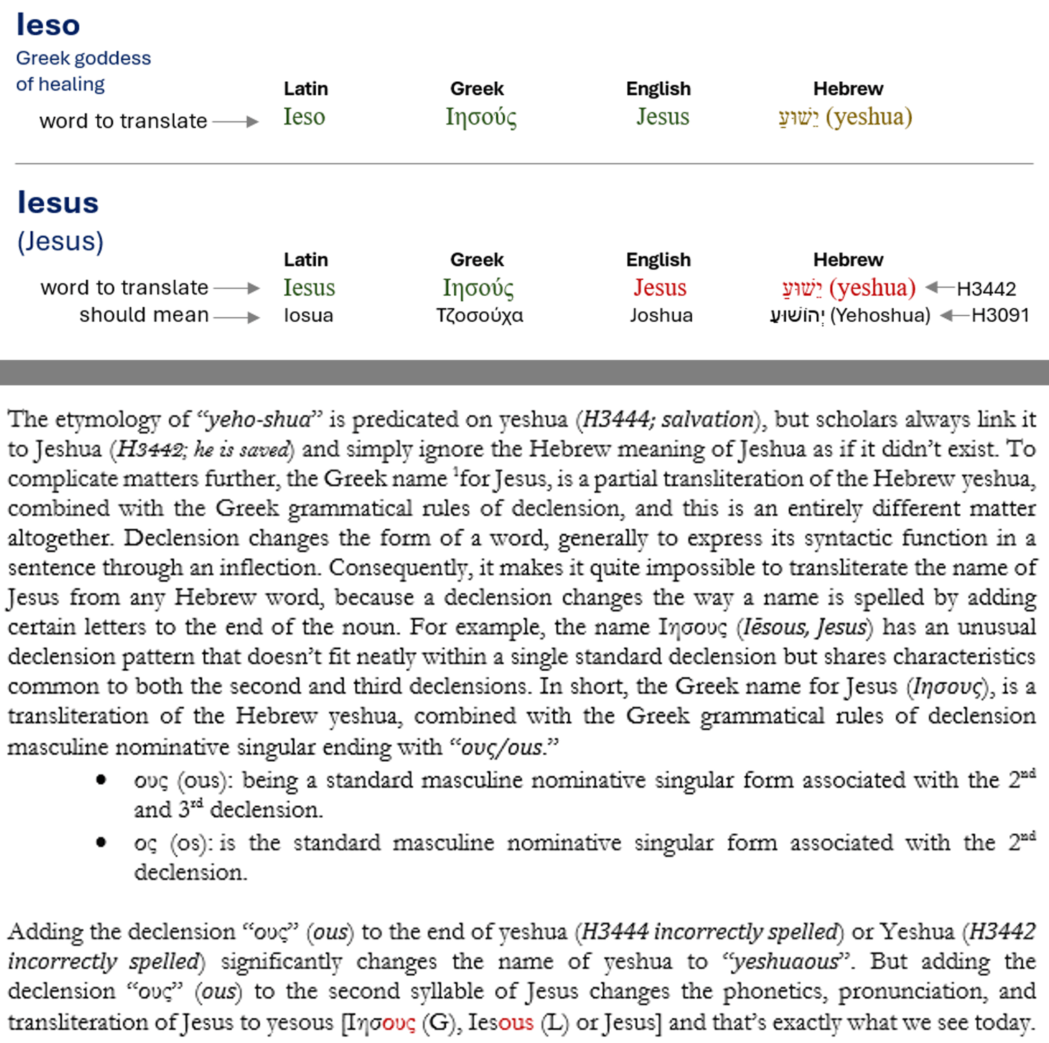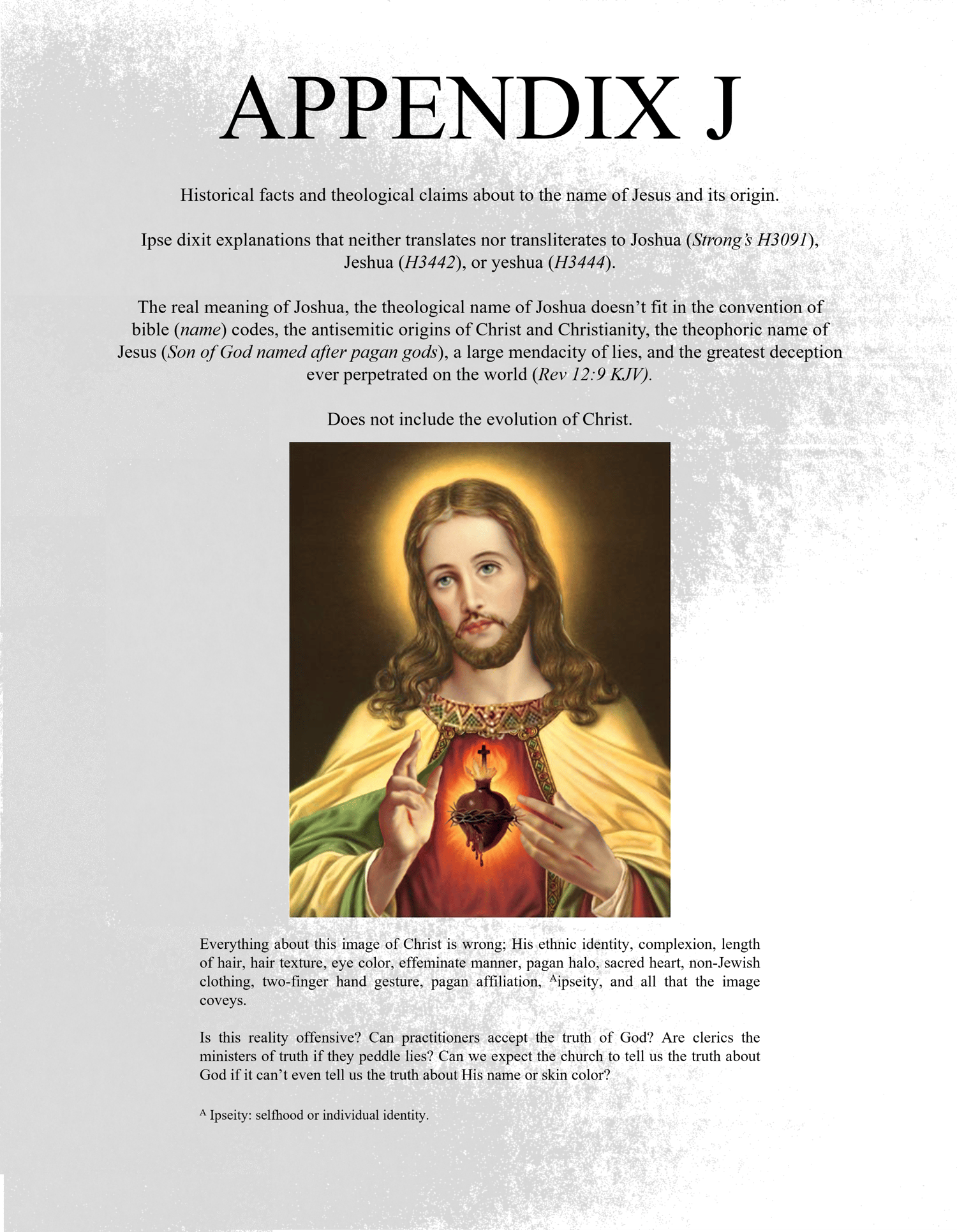 Section one of the appendix shows that the name of Jesus doesn’t translate from the Hebrew Joshua. Section two shows that the name of Jesus neither translates nor originates from the Hebrew Joshua or yeshua (Jeshua). Section three shows how the name of Joshua and Jeshua was mistranslated to define Jesus as a Greek Soter (savior god) of Rome. Section three shows that the [1]orthography and the [2]historiography of the classic Greek and Latin alphabets lacked the basic characters necessary to spell, write, or script the name of Jesus until the 16th century CE (8th cent. exception of loanwords). To wit, the earliest known version of the Latin Iesois (not Iesous) was spelled with an “i” not “u”. The earliest known version of the Greek Ἰησοις (not Ἰησοῦς) was spelled with iota “ι” not upsilon “υ”. When fitting the Erythraean Sibyls 8th century BCE prophecy within the correct orthography, historiography, and paleography of her era, the sibyl’s prophecy identifies Jesus as the antiChrist, not the Messiah. Section four reveals additional information about the name of Joshua in bible codes. Section five shows interesting facts to Christians about the namesake Christ.