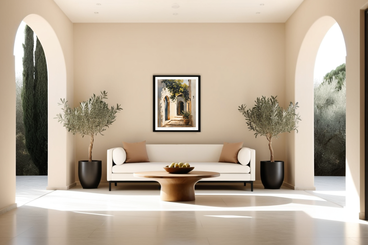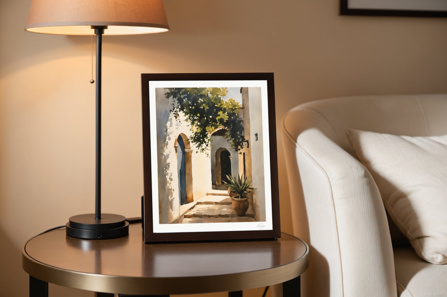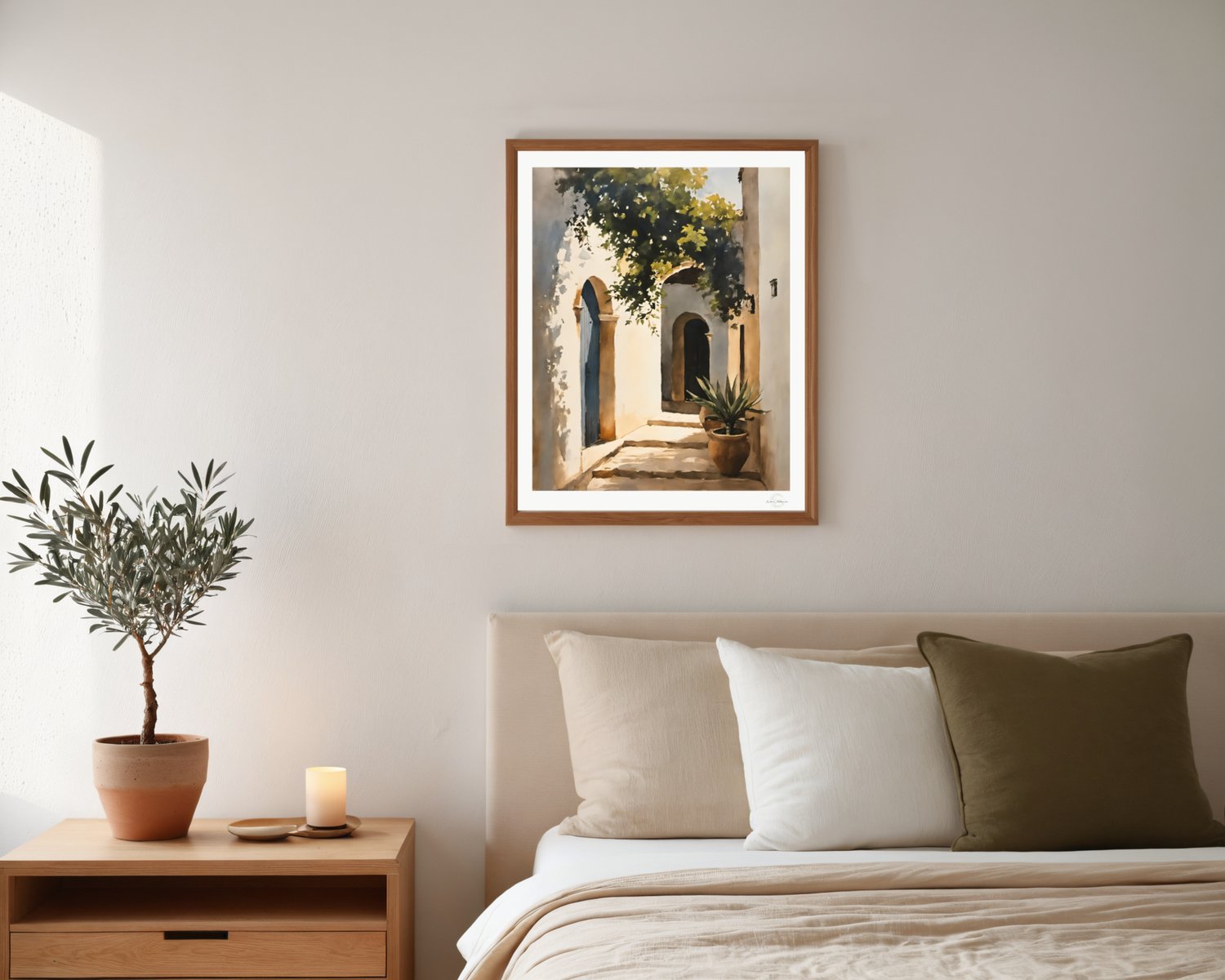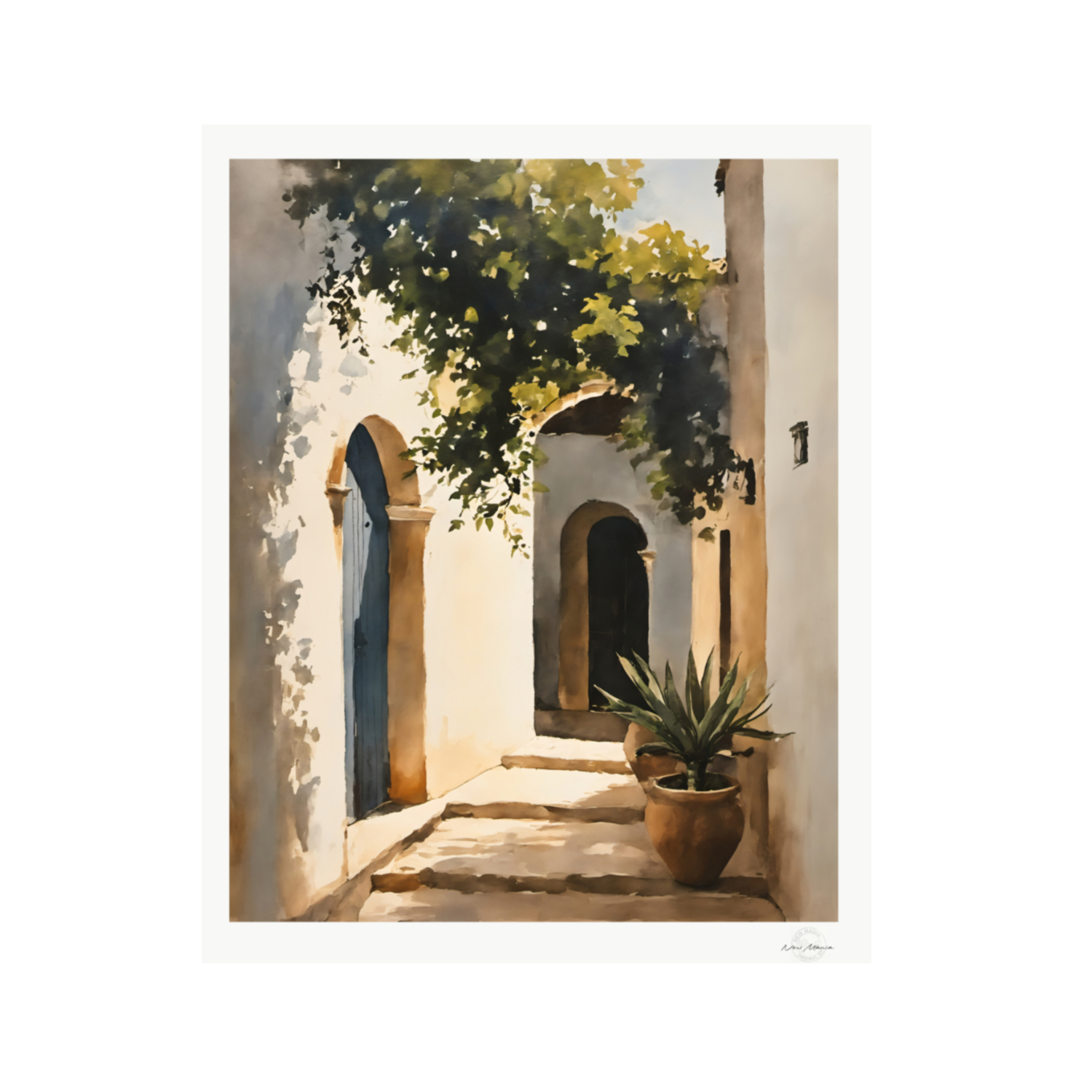 A sunlit alley with soft shadows and blue accents. A minimal architectural composition that adds depth and quiet character to any space.