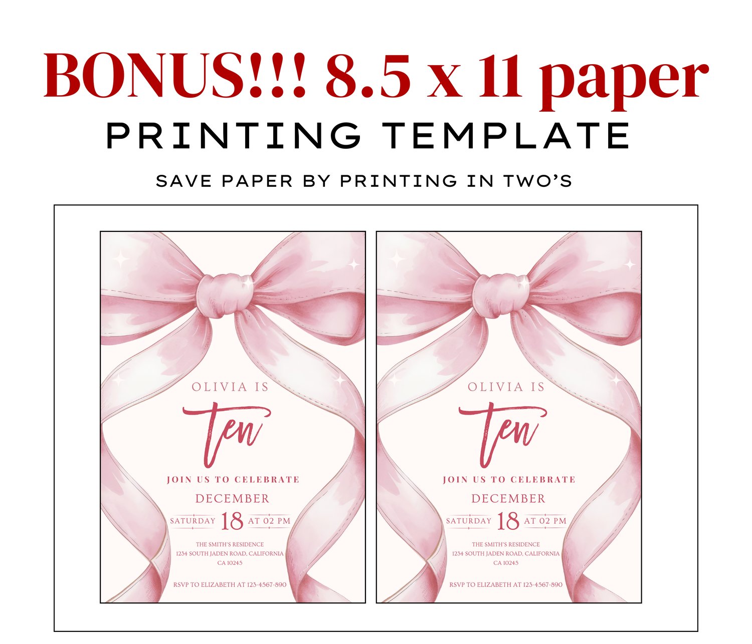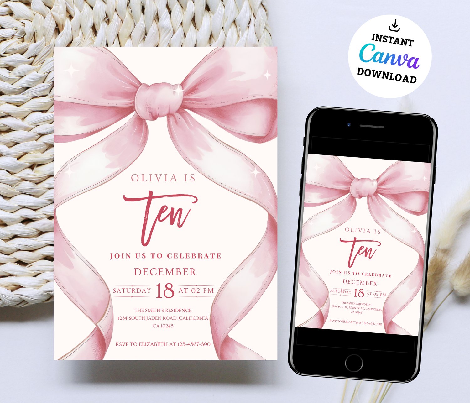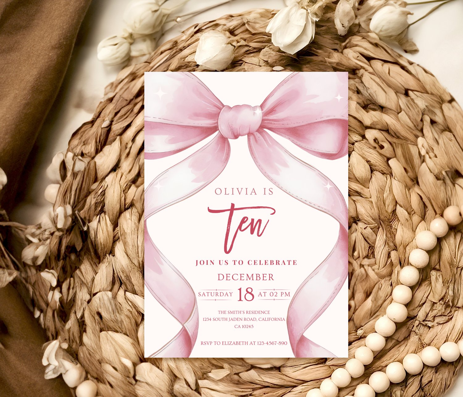 Pink Coquette Invite 10th Birthday Invitation 10 year old girl birthday invitation Girl tenth Pink Bow Birthday Evite Tween Birthday Party