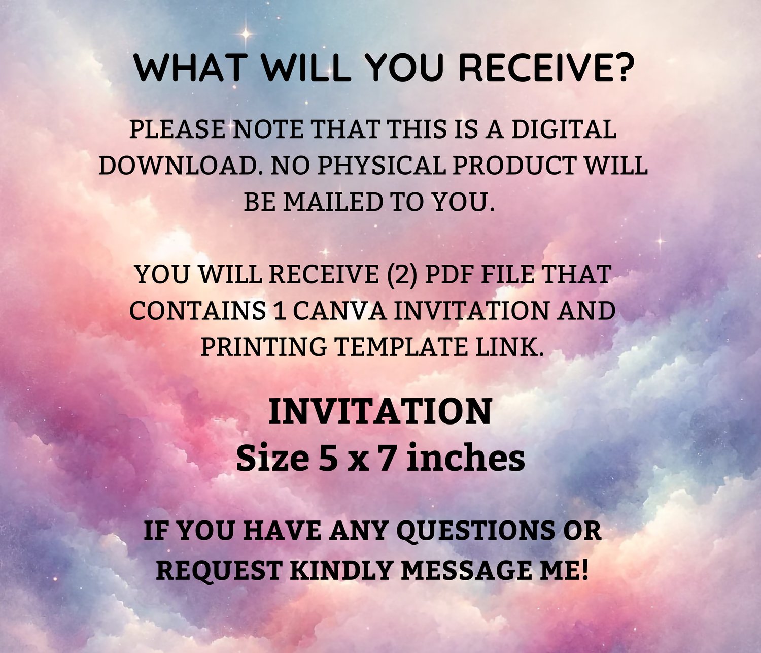 This invitation is self-editable in CANVA easy to use web app right in your own computer browser. When you’re all done editing your invitation, download the finished PDF/JPEG and print. (editable in computer and phones)